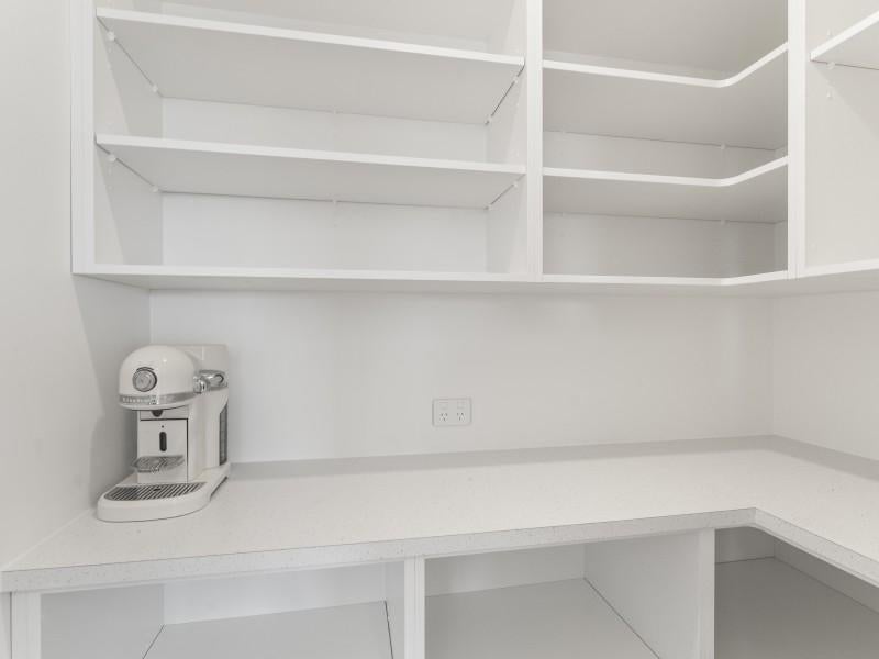 The open-plan living area forms the hub of the home, where stacking sliders connect to sunny decking for effortless indoor-outdoor flow. A well-appointed kitchen includes stone benchtops, Fisher & Paykel appliances, and a scullery/walk-in pantry, with plumbing in place for a double fridge.