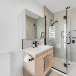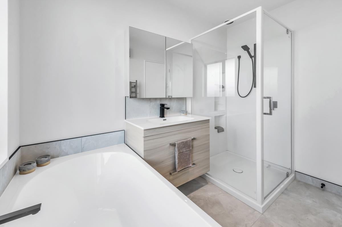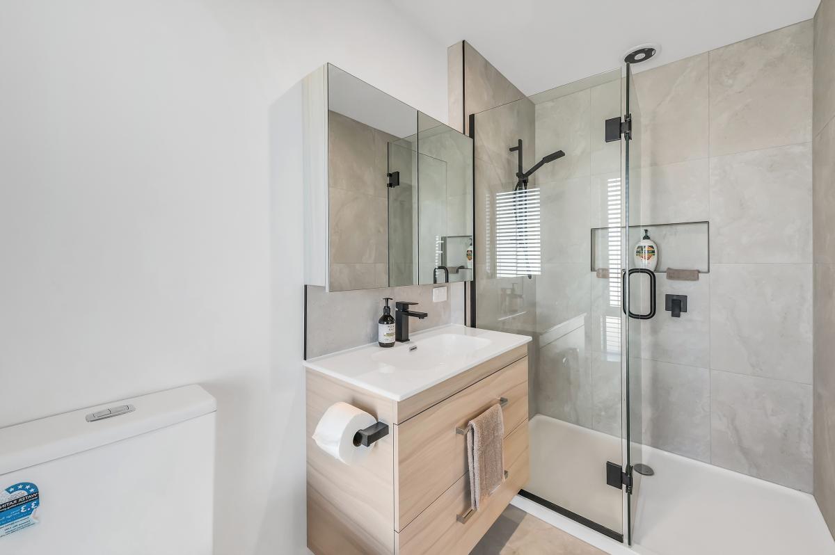 Retreat to the master suite, complete with a walk-in wardrobe and tiled ensuite shower with acrylic tray. Two additional bedrooms feature built-in fitted wardrobes, complemented by a family bathroom and a separate toilet with a hand basin.