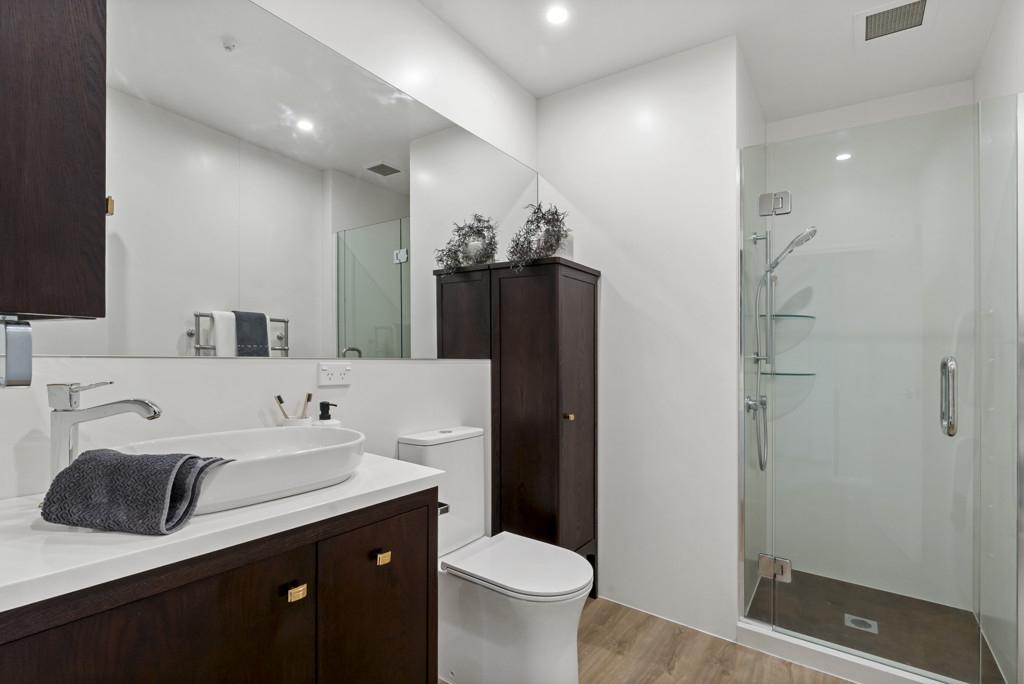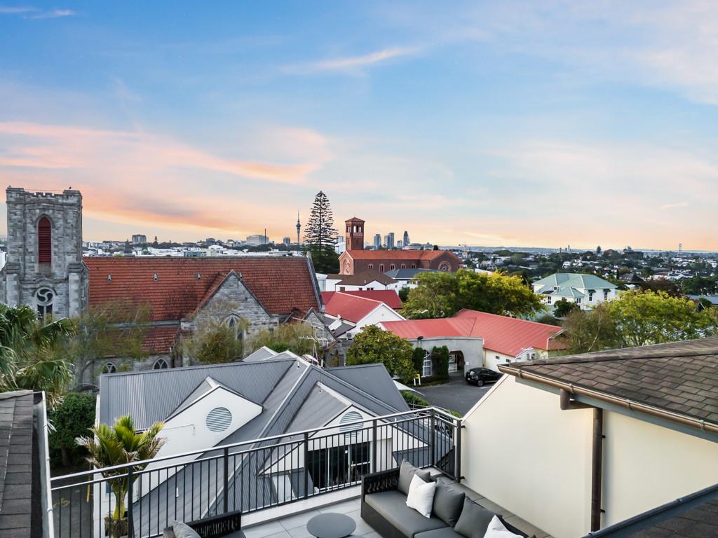 Accommodation includes three spacious bedrooms, two bathrooms, as well as an additional guest powder room. The master suite serves as a private haven of comfort and style, featuring an ensuite and direct access to a second deck with views spanning Mt Eden to Mt Hobson. A separate laundry, three secure car parks, and lift access ensure practicality is matched with elegant living.