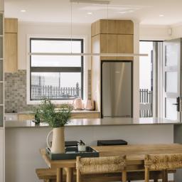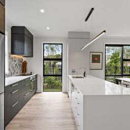 - Designer kitchens with stone benchtops, soft-close drawers, and mosaic splashbacks.