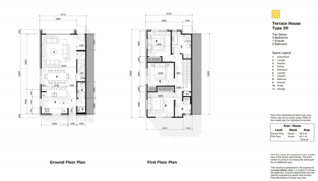 - Quality & Design: Around 15% more spacious than comparable homes. Features include modern architecture, three interior palette options (Light, Mid, Dark), stone benchtops, and standard mosaic tile splash backs.