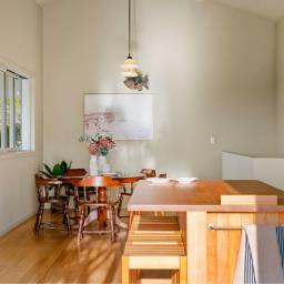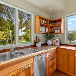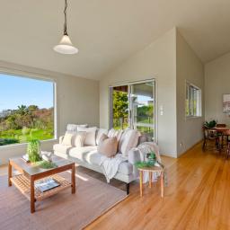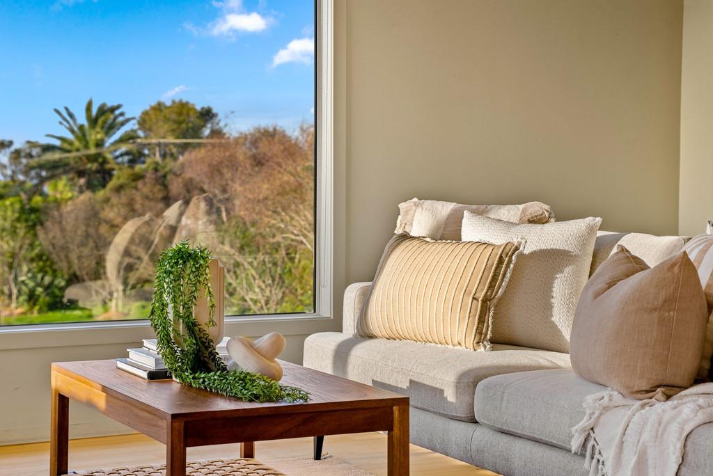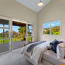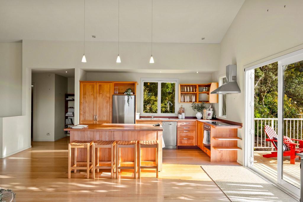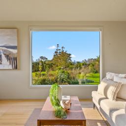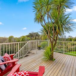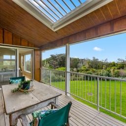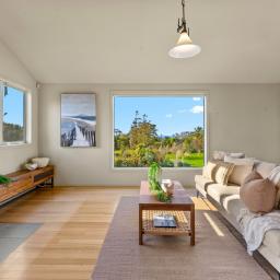 This generous 4-bedroom, 3-bathroom residence is designed for comfort, with solar, underfloor heating, and connection to nature. The upper level features a spacious open-plan living area that flows seamlessly onto a sun-drenched deck with Louvretec shutters, perfect for year-round entertaining. The master bedroom also opens onto the deck, providing a private retreat with views over the property and the sea.