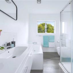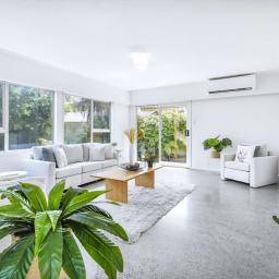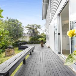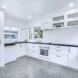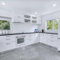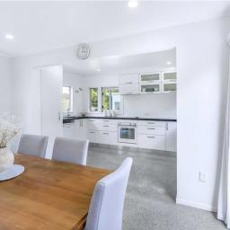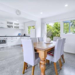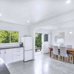 The home offers an open plan modern kitchen with quartz bench top and customised modern soft close draws and cupboards with quality finishings. Polished concrete floors throughout the downstairs provide a sleek, low maintenance finish. The kitchen dinning area flows onto a generous sun soaked deck area with seating, perfect for entertaining with a private gully backdrop.