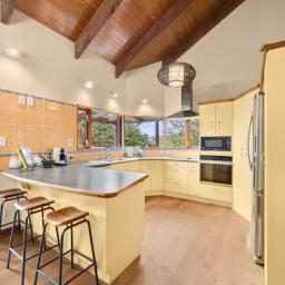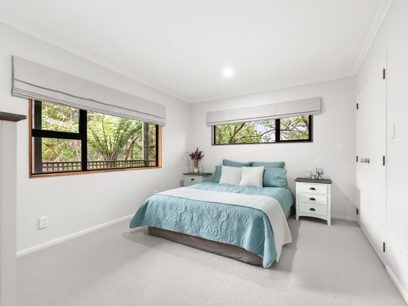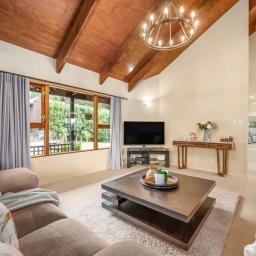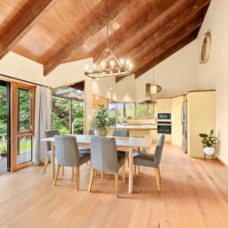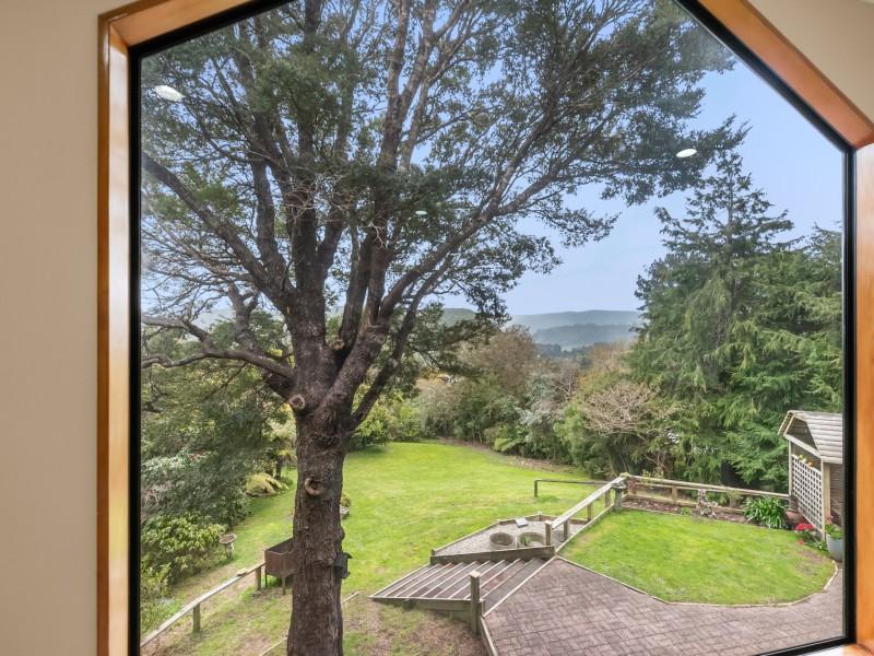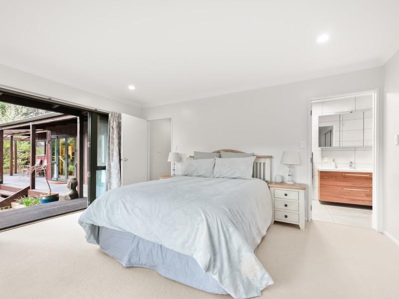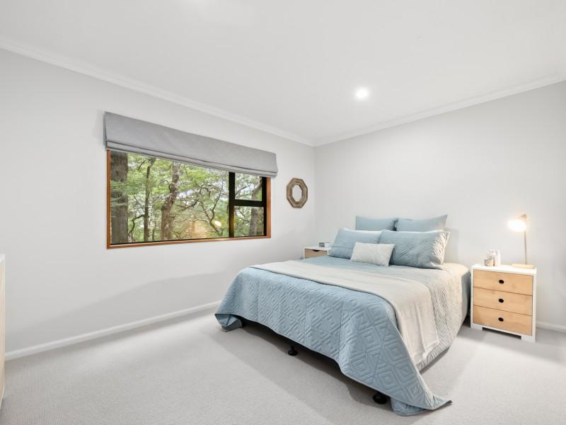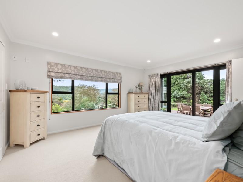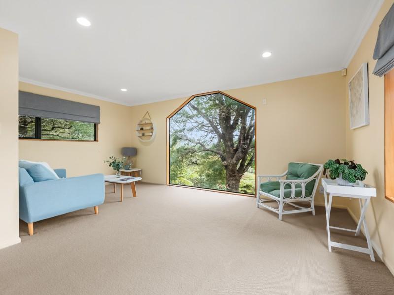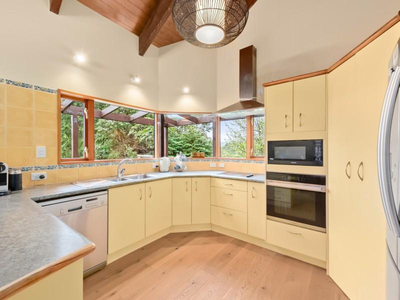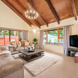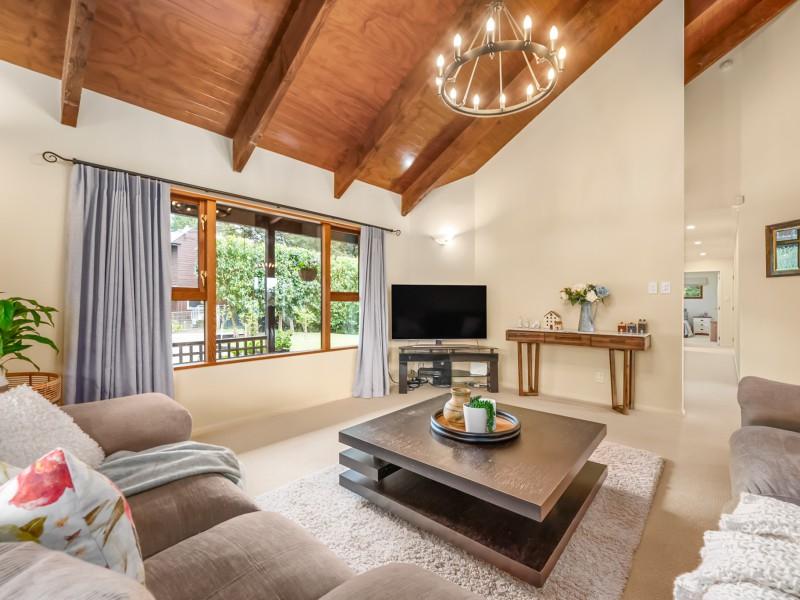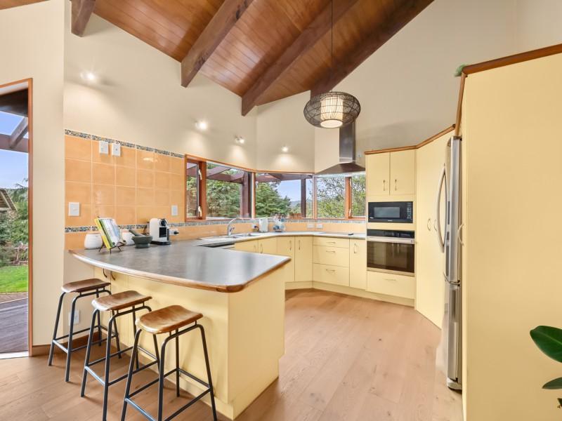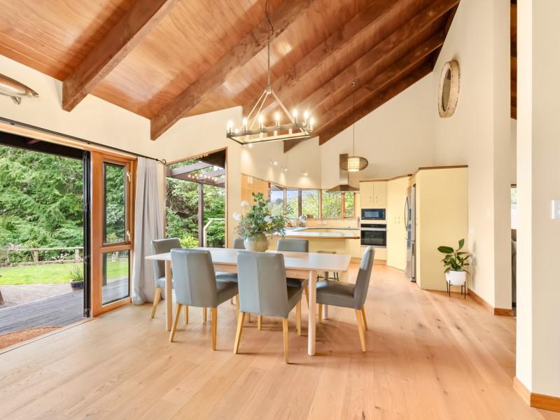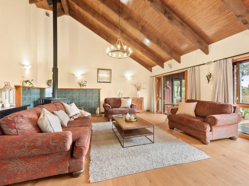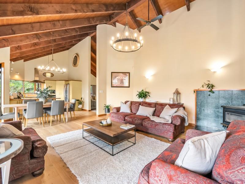 This home exudes warmth and charm for family living and entertaining. Soaring double height ceilings above the living areas with 2 sets of doors that open onto the sunny deck and patio areas with vistas over the landscaped gardens and tree lined valley surrounds. The main lounge is expansive and sun filled, perfect for unwinding or entertaining on a grand scale. New light oak floors compliment the natural aesthetic of this home. The living areas are anchored by a woodburner and the home is complimented by two heat pumps ensuring you will be cozy all year round.