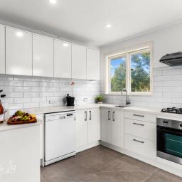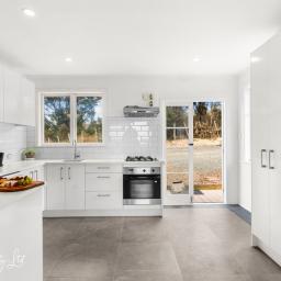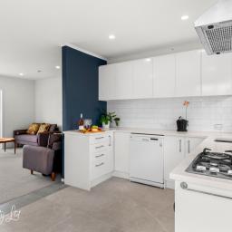 The light-filled open plan living, dining, and kitchen area is stylish yet inviting, featuring granite benchtops, generous cabinetry,