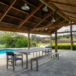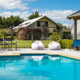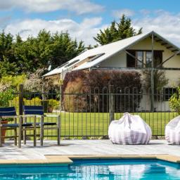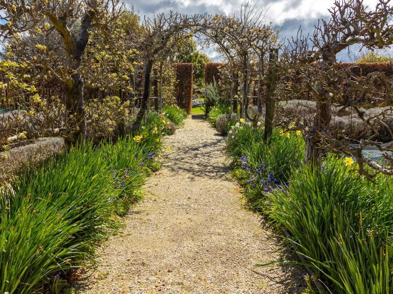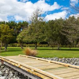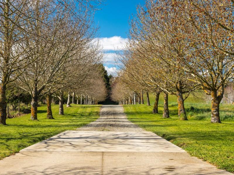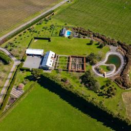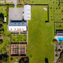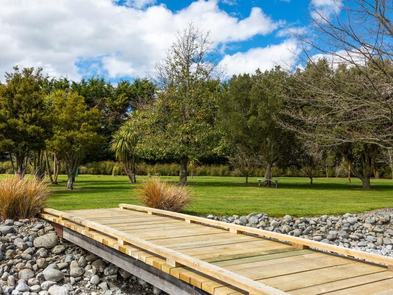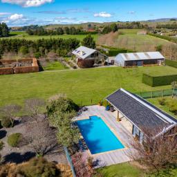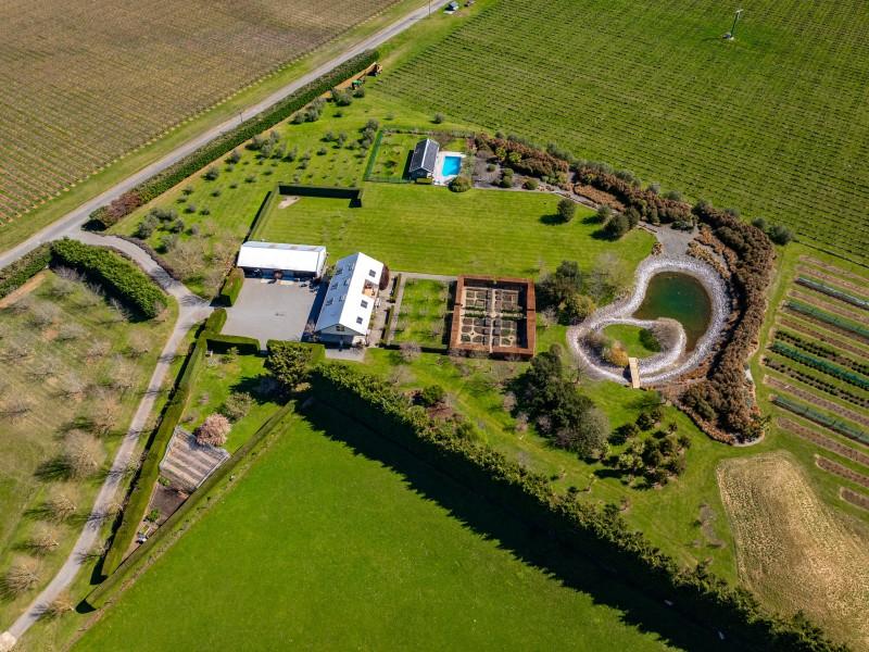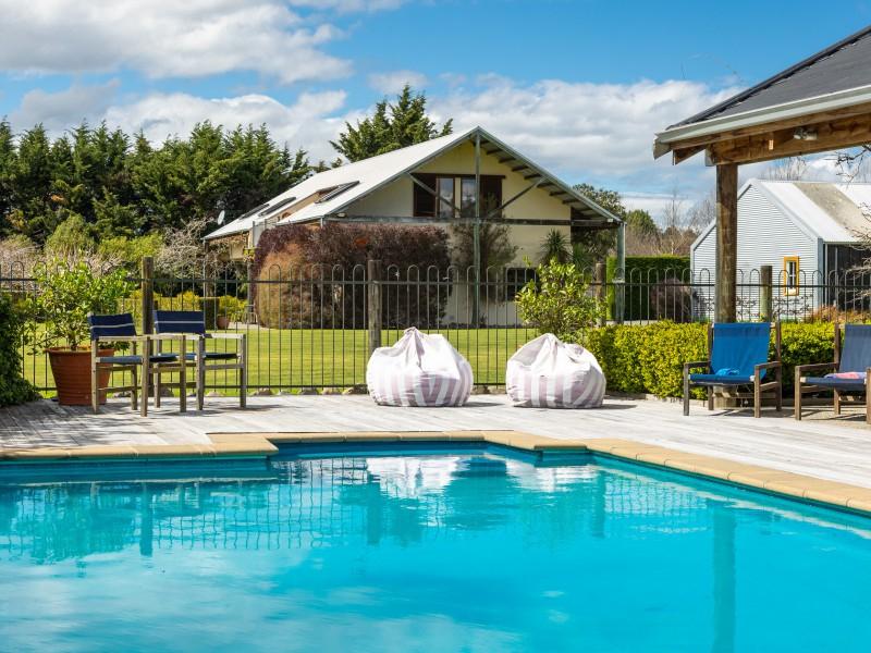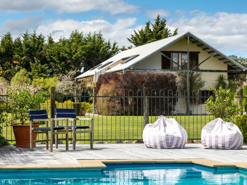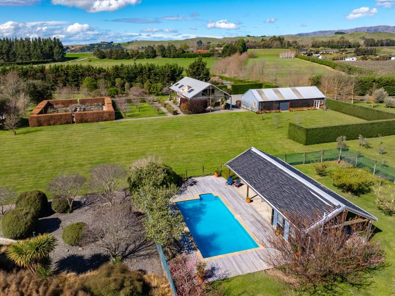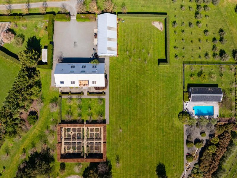 Utilising a selection of native grasses, shrubs and trees, tastefully blended with exotic specimen and fruit trees, and working to a design by Robert Watson, Landfall Estate has been attractively planted to provide an aesthetic balance of productive areas, private spaces and room for recreation. The beautifully maintained hedged potager is a feature, as are the heated in-ground swimming pool complete with pool house, and a rill flowing to an ornamental lake, complete with a bridge to an island in the middle.