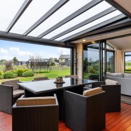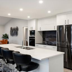 At its heart lies an impressive open-plan kitchen, dining, and living zone, bathed in natural light and designed for seamless indoor–outdoor flow. The space opens onto a covered deck with a Sunvue sunshade, creating the perfect setting for year-round gatherings and relaxed outdoor living. Refined details such as two heat pumps, ample storage, a double internal-access garage, and a hot-tap insinkerator elevate the everyday experience.