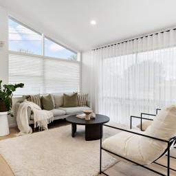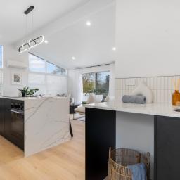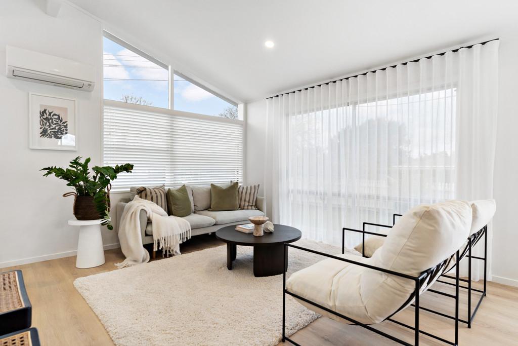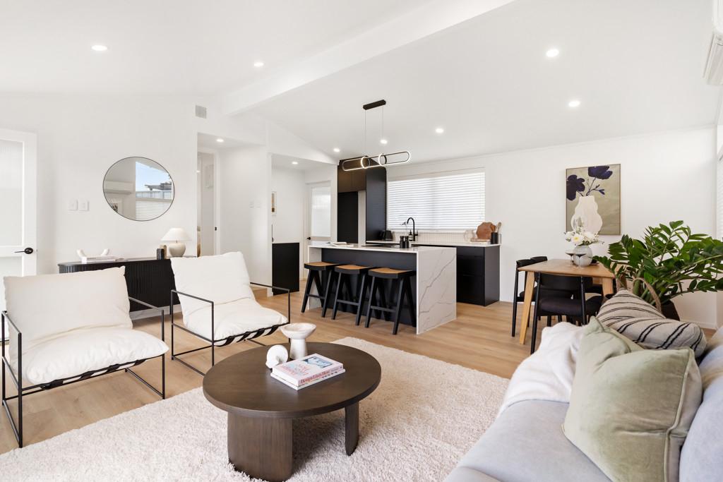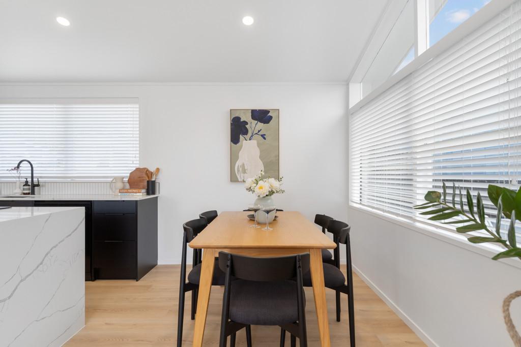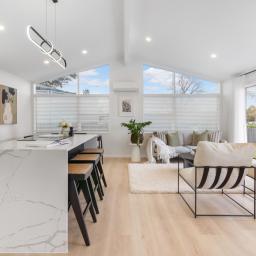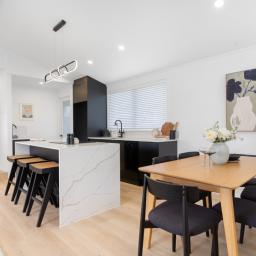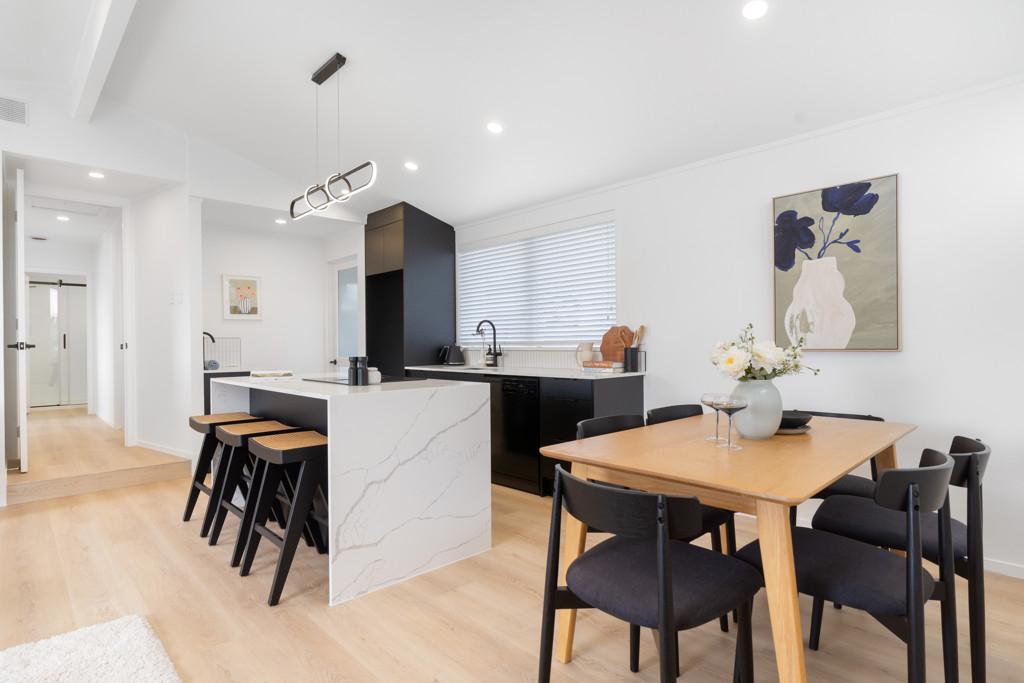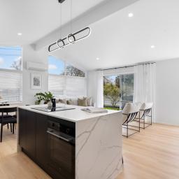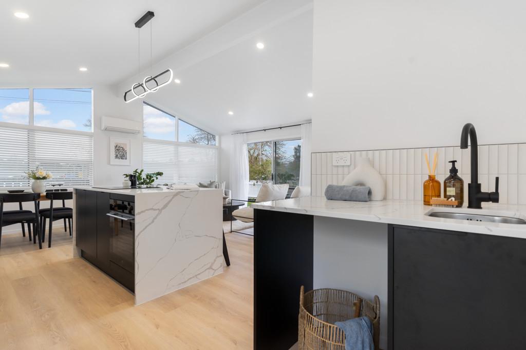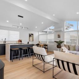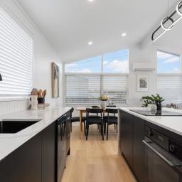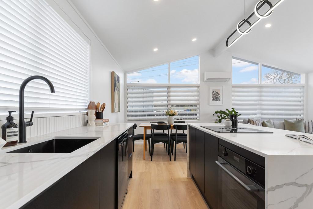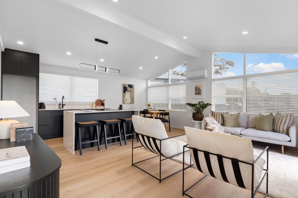 • Open plan kitchen and dining with elevated ceilings and ceiling height joinery in the lounge