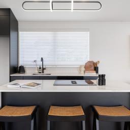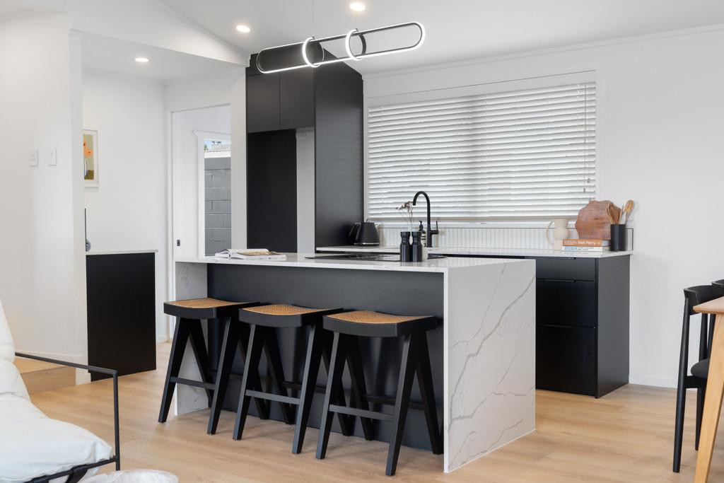 • A sleek black & marble themed kitchen with stunning waterfall bench tops, black appliances, pencil tiling, and a matching laundry adjacent
