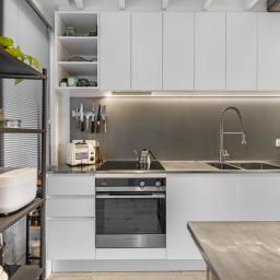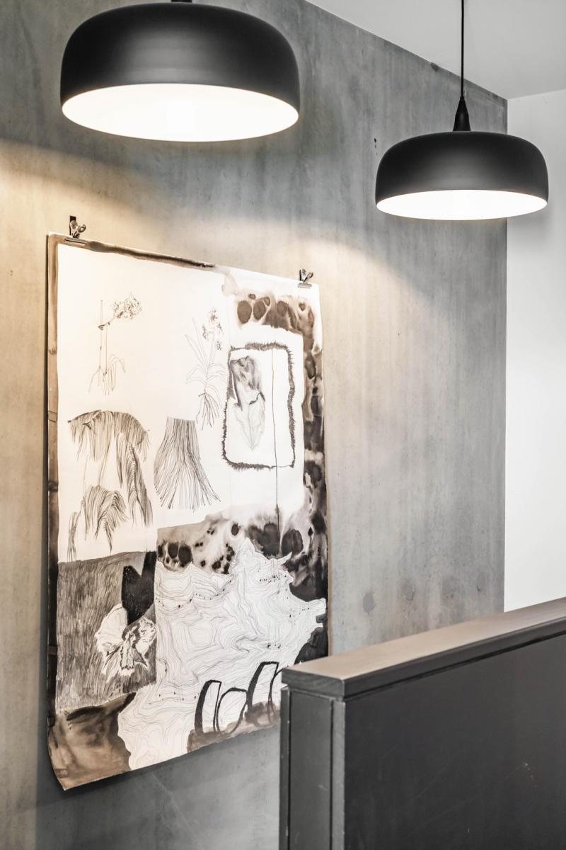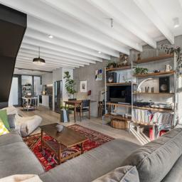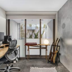 Combining industrial style in the poured concrete walls with a natural feel of the sleek timber flooring, this home is an effortless display of contemporary design. Add to that the exposed beams and the block of contrasting colour in the black staircase there is a depth and warmth to the home.