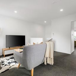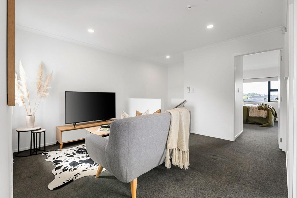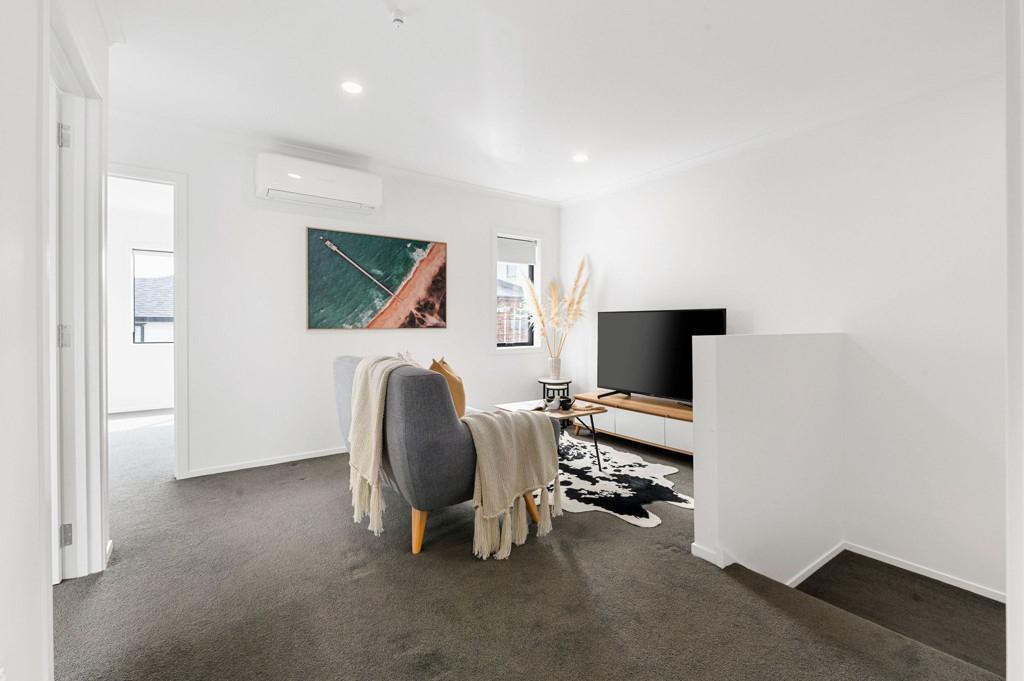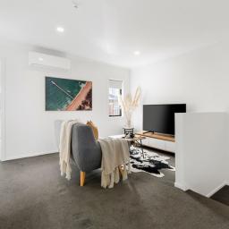 On entrance, discover a light-filled open-plan living and dining area, complemented by a sleek kitchen with gas cooking, a dishwasher, and ample storage. Sliding doors open to an elevated outdoor space, making for effortless indoor-outdoor flow and showcasing sweeping urban views. Upstairs, a second lounge provides valuable flexibility for growing families, while two heat pumps ensure year-round comfort.