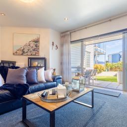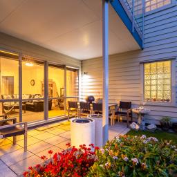 Two decks give you two perspectives: west to the pool and gardens, with glimpses of Kapiti; east to the energy of the village and the hills beyond.