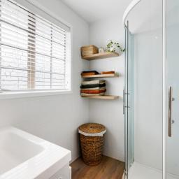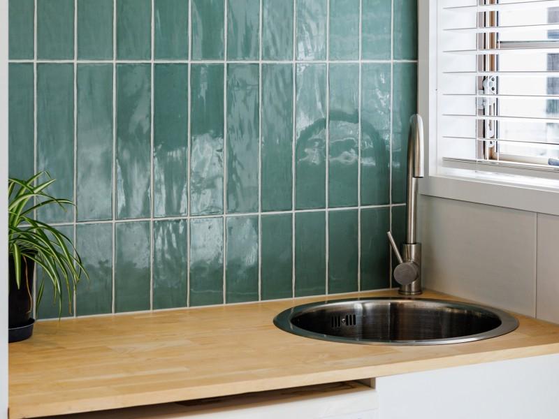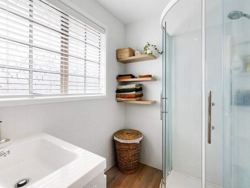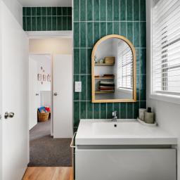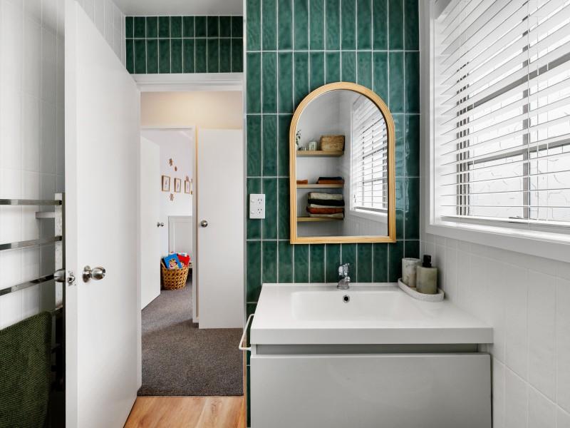 The sleek bathroom, adorned with feature tiling that adds a touch of sophistication to your daily routine.