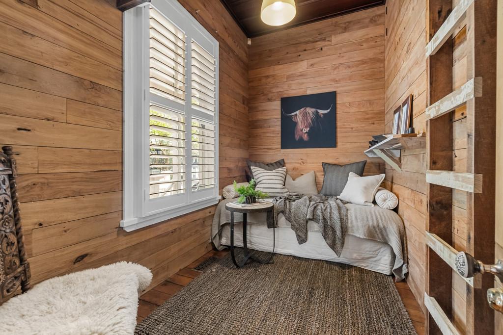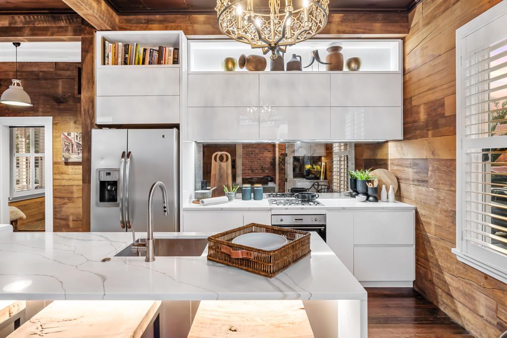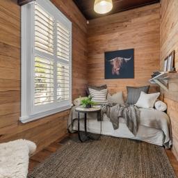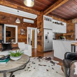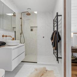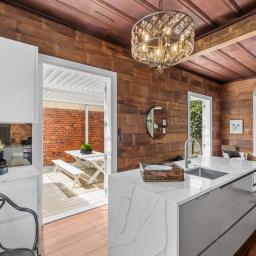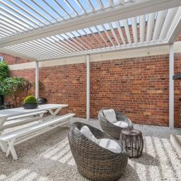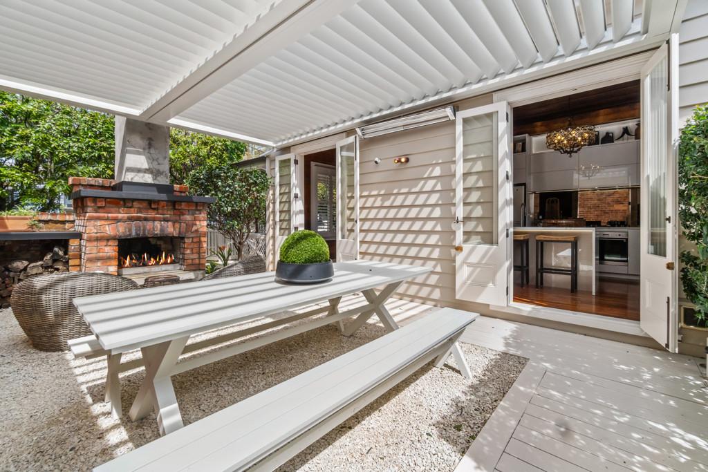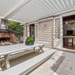 Light-filled and refined, the living space opens to a north-facing courtyard designed for effortless entertaining or peaceful mornings. With outdoor heating, a brick fireplace, and an electric louvred roof, it's an all-season retreat that captures both warmth and atmosphere. Inside, a marble-topped kitchen with touch-open cabinetry pairs precision with simplicity, while polished kauri floors and elegant detailing reflect the home's historic soul.