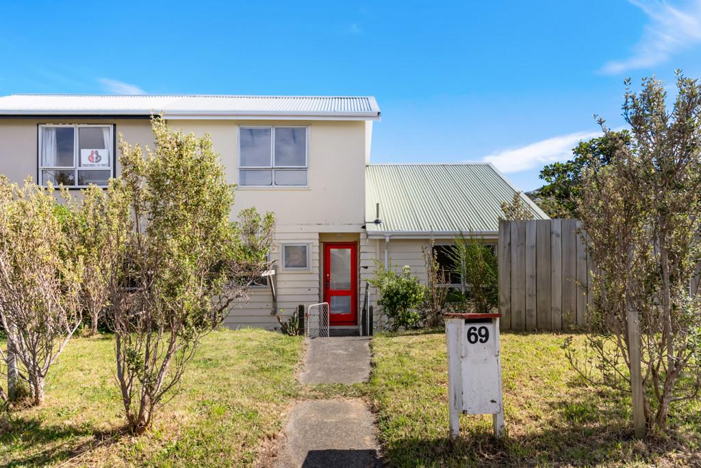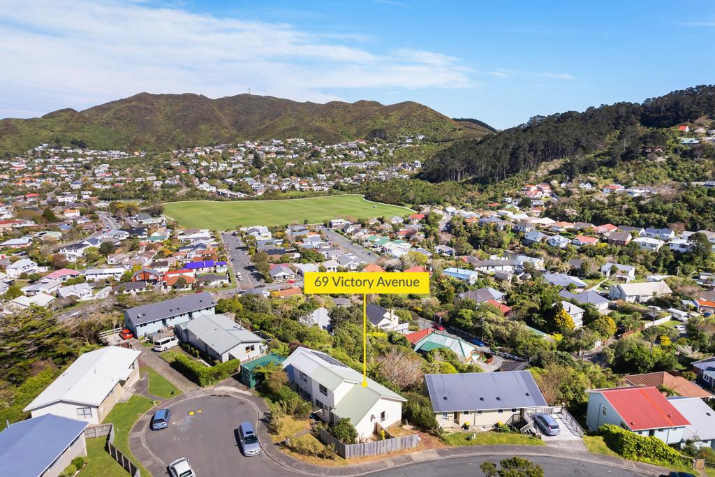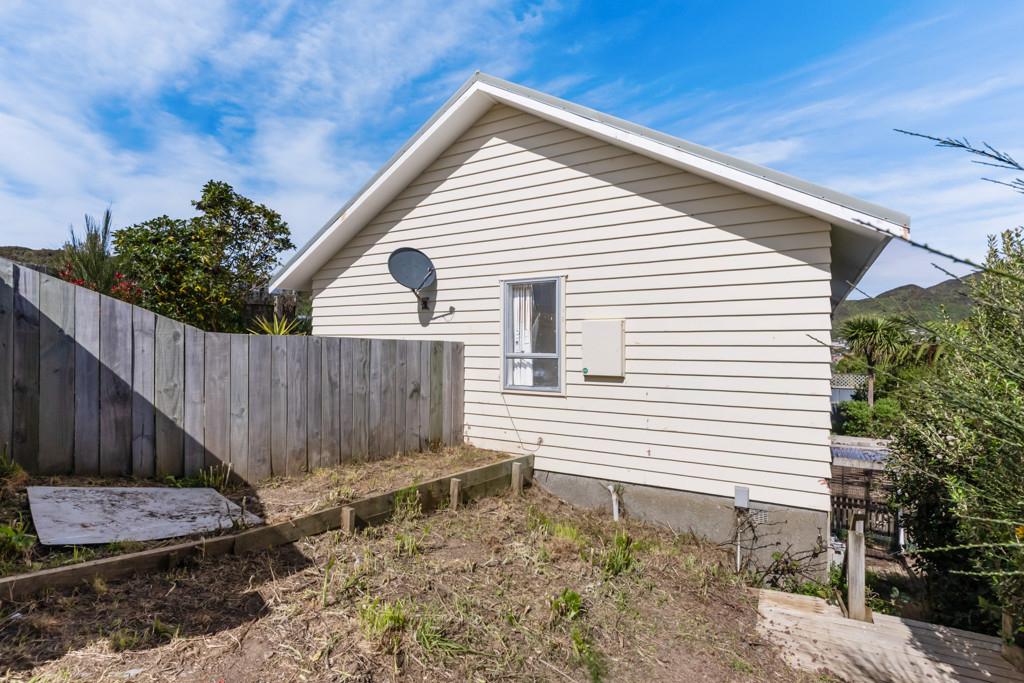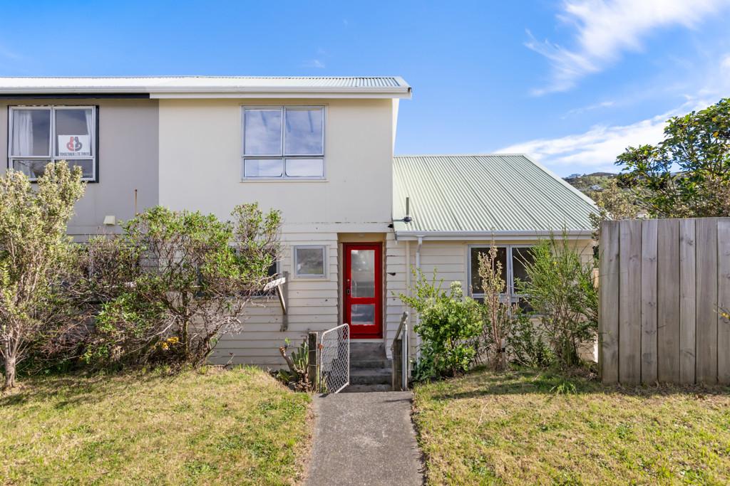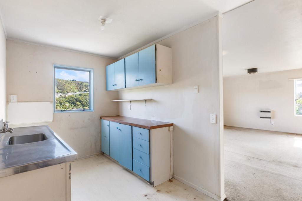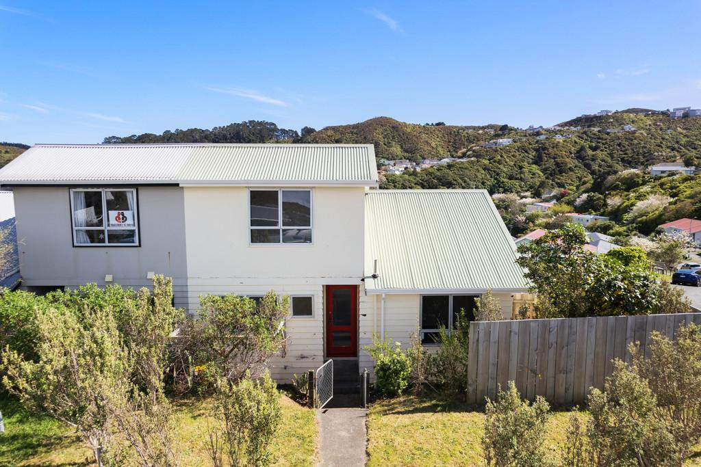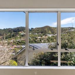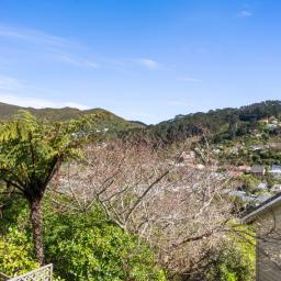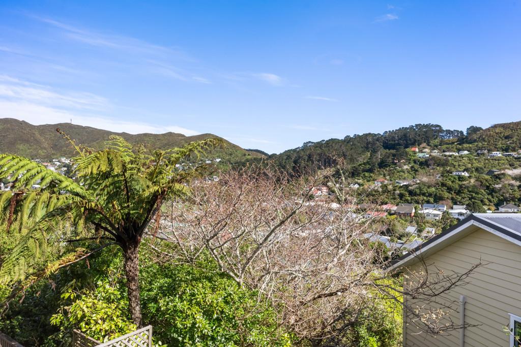 This 1970s two-bedroom home sits elevated on a sunny corner site with dual access, capturing views across bush-clad hills and Karori Park.