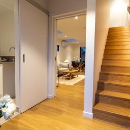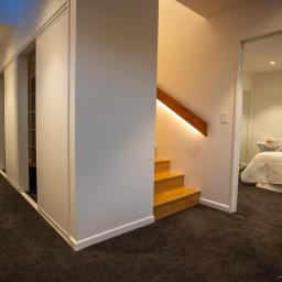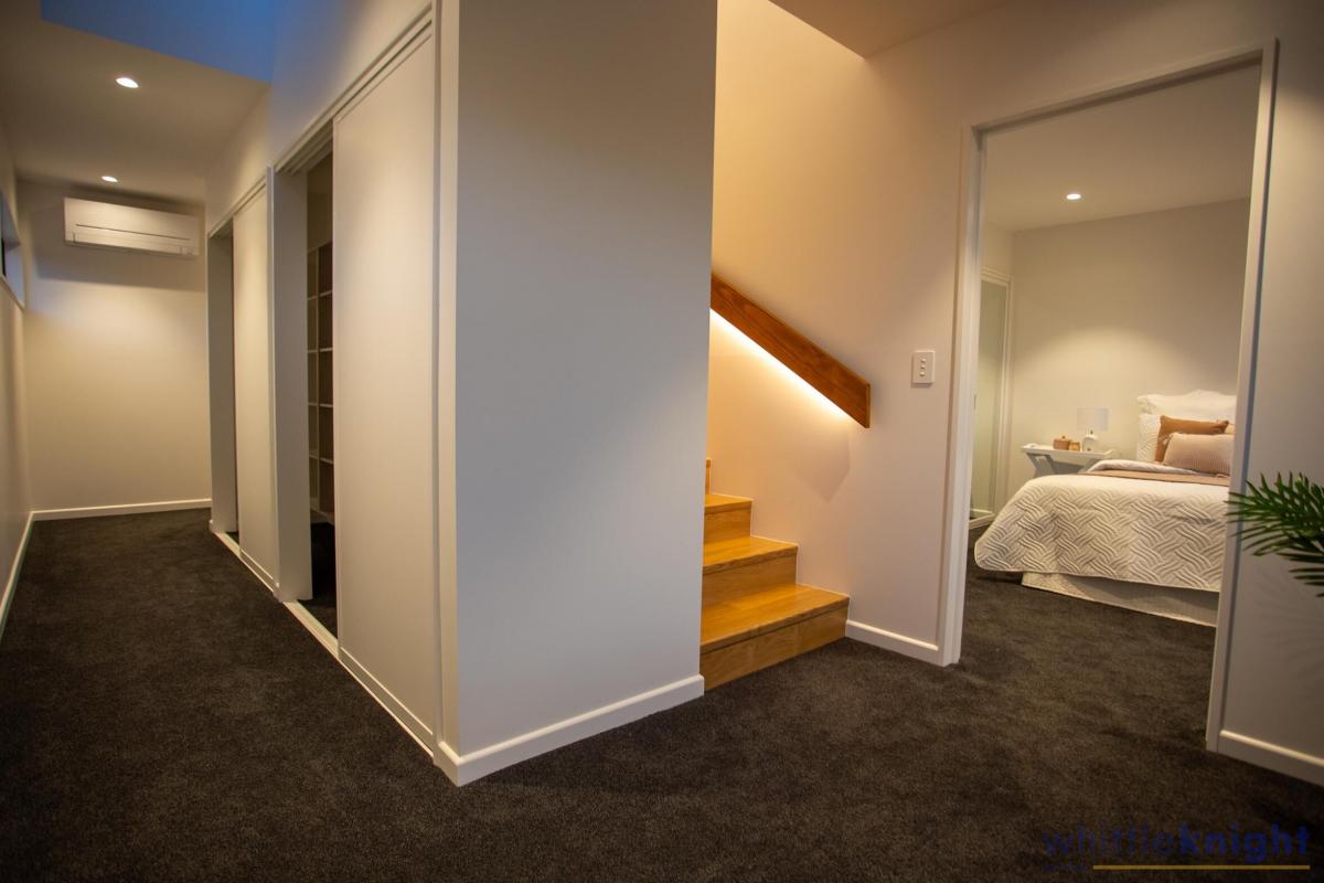 The ground floor is all ease and connection: a refined galley kitchen (stone benchtops, artisan tile splashback, LED task lighting, integrated shelving) anchors dining and living, sliding doors dissolve to the courtyard for effortless entertaining. The staircase is a design moment in itself—timber treads with concealed wall lighting guiding you upward.