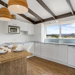 • Open plan living and kitchen framed by large windows showcasing ocean glimpses.