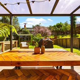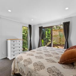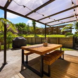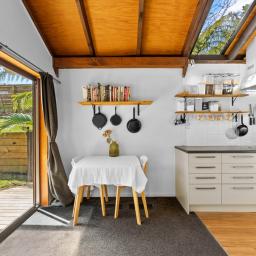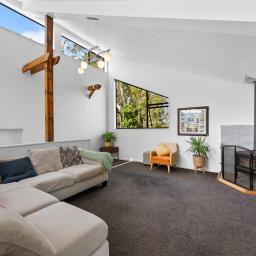 The heart of the home features a cosy step-up lounge with wood burner and large windows that showcase the lush natural surrounds. The open-plan kitchen and dining are bathed in natural light from overhead skylights and multiple sliders that open out to a sunny, north-facing deck. Step outside to enjoy a generous, partially covered entertaining space that connects beautifully with a flat and fully fenced lawn anchored by a blossoming peach tree - perfect for kids, pets or relaxed weekends.
