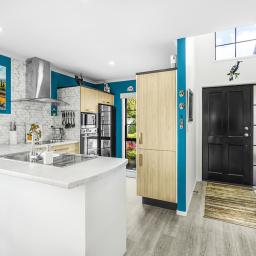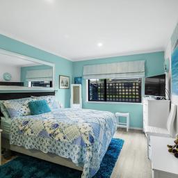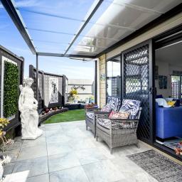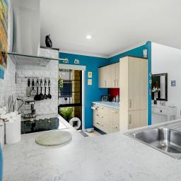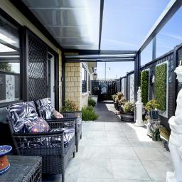Inside, you'll find a beautifully modernised two-bedroom, two-bathroom layout with thoughtful touches throughout. The stylish wrap-around kitchen features stainless steel appliances, a wall oven, and excellent storage with both cupboards and drawers. Open-plan living connects seamlessly through two ranch sliders to the private outdoor areas - a side and rear patio with a covered pergola and pull-down blind, creating the perfect sheltered spot to relax or entertain year-round.