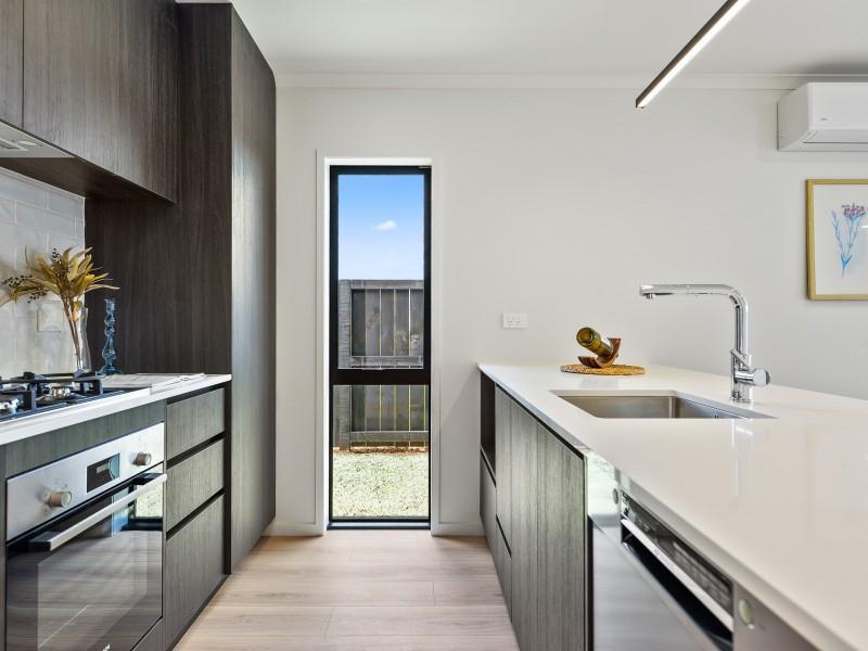Step inside to a sun-drenched lounge where expansive windows invite warmth and light. The vibrant open-plan dining, living, and kitchen zone is designed for connection and celebration. The chic kitchen features a fresh-air window, appliances including a gas cooktop, and a stylish breakfast bar—perfect for quick bites and casual chats. Slide open the ranch doors to reveal a spacious deck, your private alfresco haven. Whether hosting summer soirees or enjoying a quiet morning coffee, this outdoor oasis offers the perfect blend of sun, serenity, and sophistication.