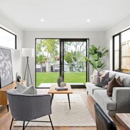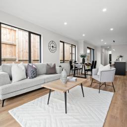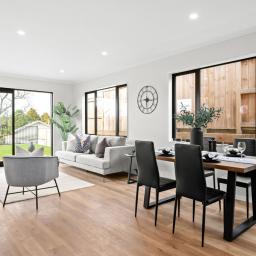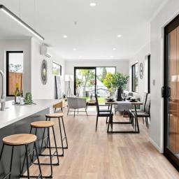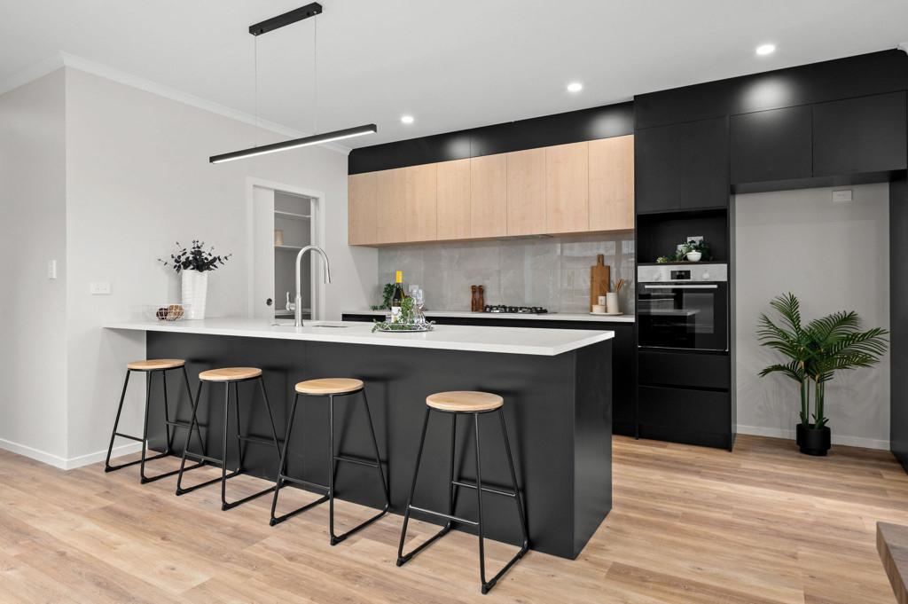 Step inside to discover bright, open-plan living, kitchen, dining, and lounge that effortlessly offers relaxed living with easy entertaining. The designer kitchen impresses with engineered stone benchtops, premium Bosch appliances including gas cooking, and a sleek island breakfast bar. A fully equipped scullery keeps the clutter out of sight, maintaining the kitchen's clean and contemporary aesthetic.