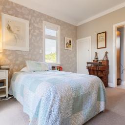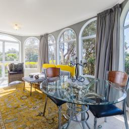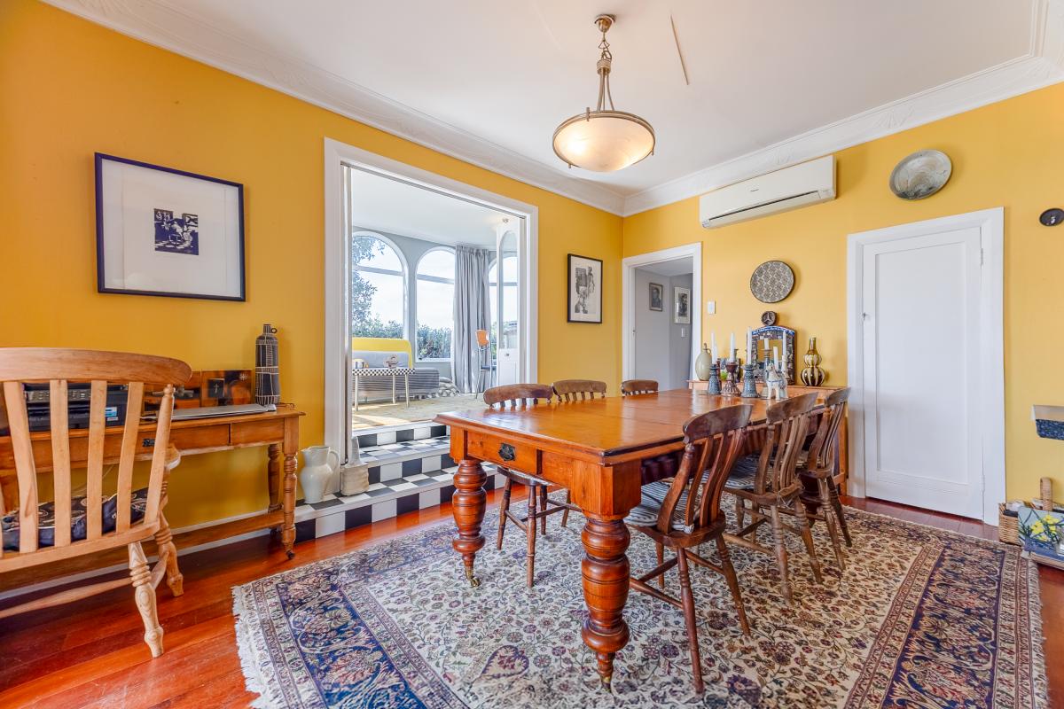 Built in the late 1930s, the home celebrates timeless architecture — stucco curves, arched windows, and original timber floors. Elevated above the street, it enjoys abundant sun, pocket sea views, and an exceptional sense of privacy. Inside, open dining and kitchen spaces flow to a semi-circular sunroom that catches the afternoon light. The lounge, complete with an open fire, is the heart of the home.