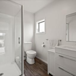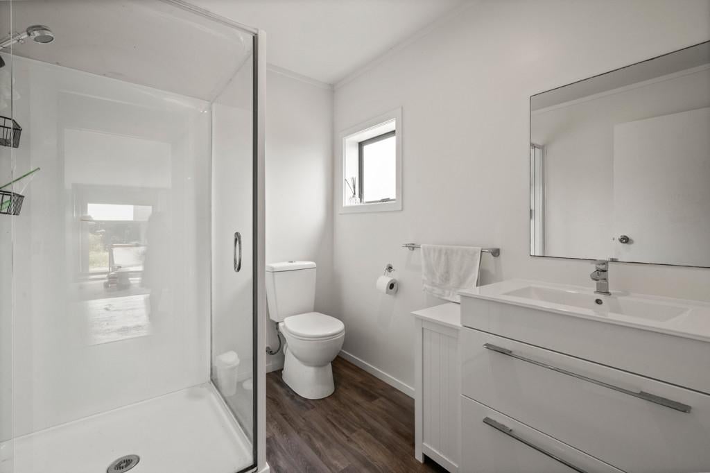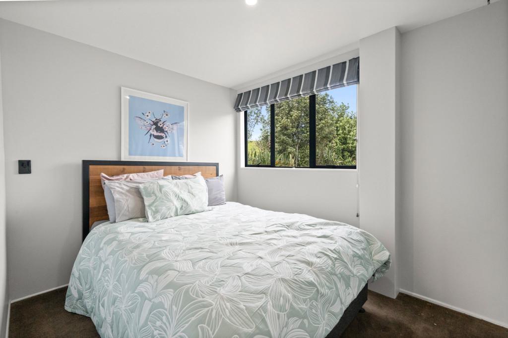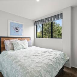 The modern and cozy tiny home is double-glazed and comes with its own fenced yard, off-street parking, and a covered deck offering views over Auckland.
