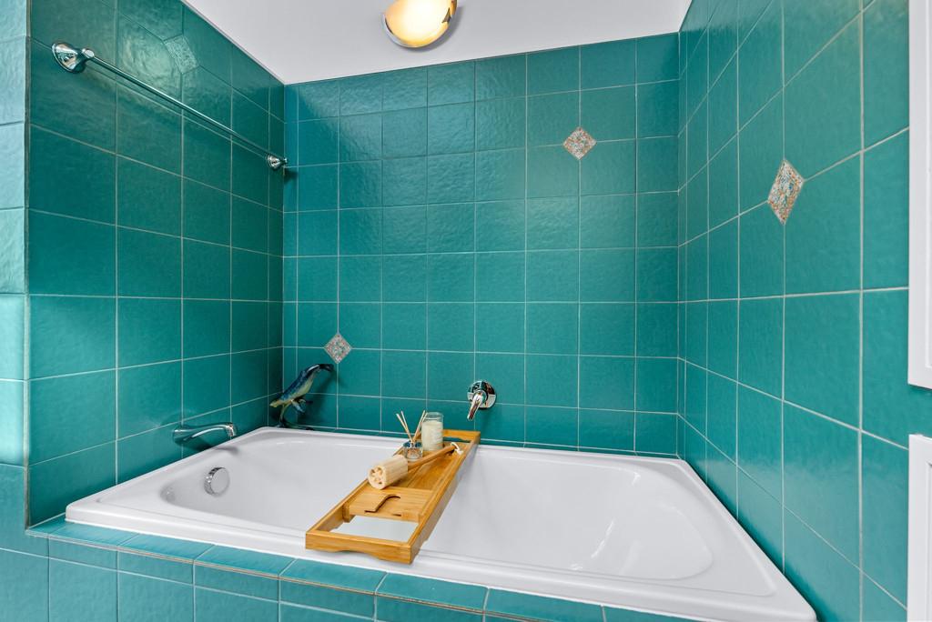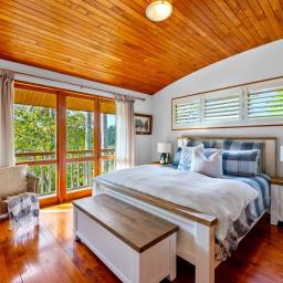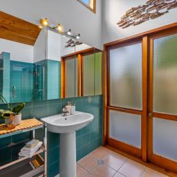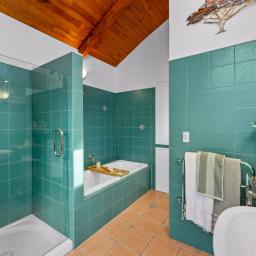Downstairs is another bedroom and the additional office, which offers flexibility for remote work or a creative studio, opening onto a deck where you can soak in the spa pool to unwind and relax, listening to the birds in the bush. The second bathroom and the large double garage are also on this level.
