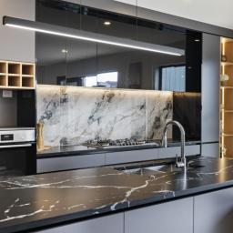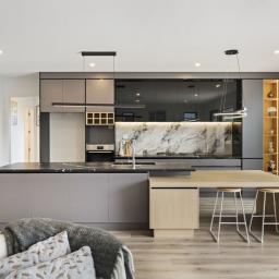 • Designer kitchen with engineered stone island and integrated table-style bench, and walk-in pantry