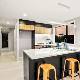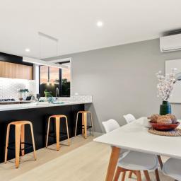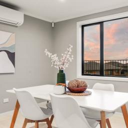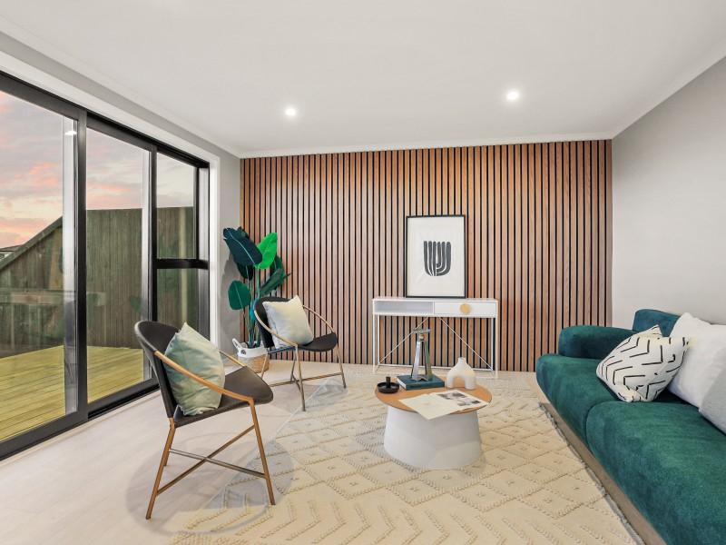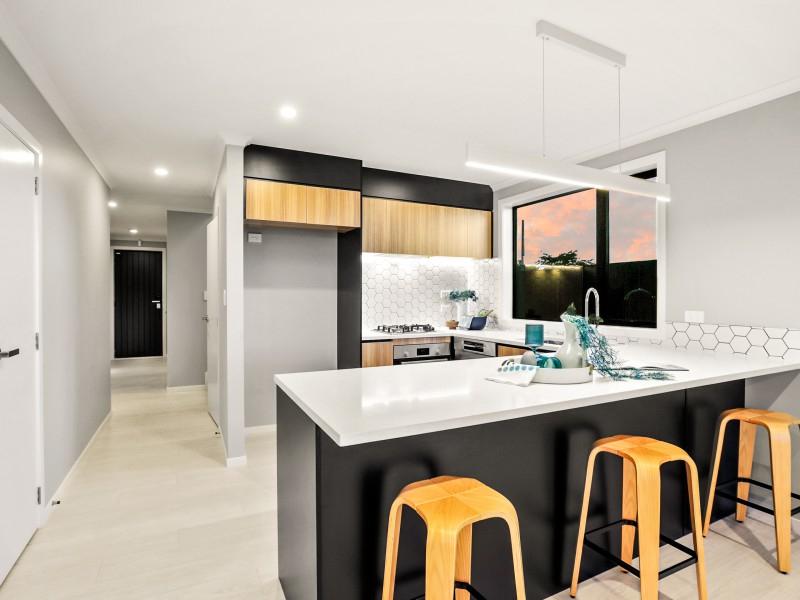 Convenience is key, with a fourth bedroom located on the ground floor. This bedroom is seamlessly connected to a bathroom and provides direct access to a cozy wooden deck—ideal for a quick outdoor escape or private entry. At the heart of the home, you will find a modern kitchen with a dine-at counter that opens into a bright living area, emphasizing a lifestyle focused on indoor-outdoor entertaining. The outdoor space invites you to unwind, featuring a stylish wooden deck that enhances the home’s aesthetic appeal, complemented by textured design elements, a striking feature wall, and on-trend fittings. A ventilation system ensures the home remains healthy and comfortable year-round. The carpeted garage includes a full laundry setup, while ample storage options provide added convenience.