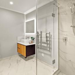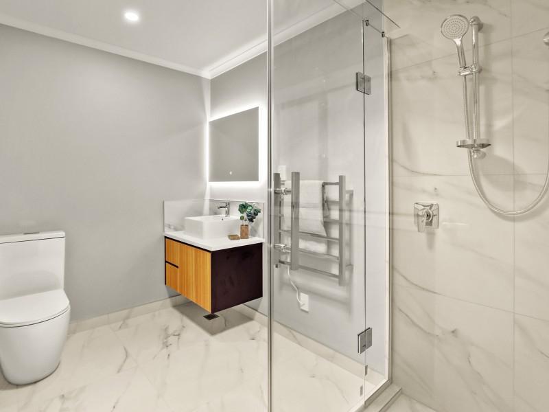 Spanning two thoughtfully designed levels, the townhouse includes four spacious bedrooms and three luxurious bathrooms, all equipped with tiled showers and modern LED mirrors. The first floor hosts three bedrooms, including a master suite, along with a family bathroom. Both the master and second bedrooms come with generous walk-in wardrobes. The upstairs bathroom features a relaxing stand-alone tub and a shower combo, while elevated views from the upstairs bedrooms are framed beautifully by stainless steel stairwell handrails.