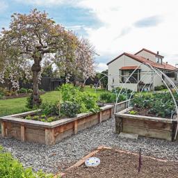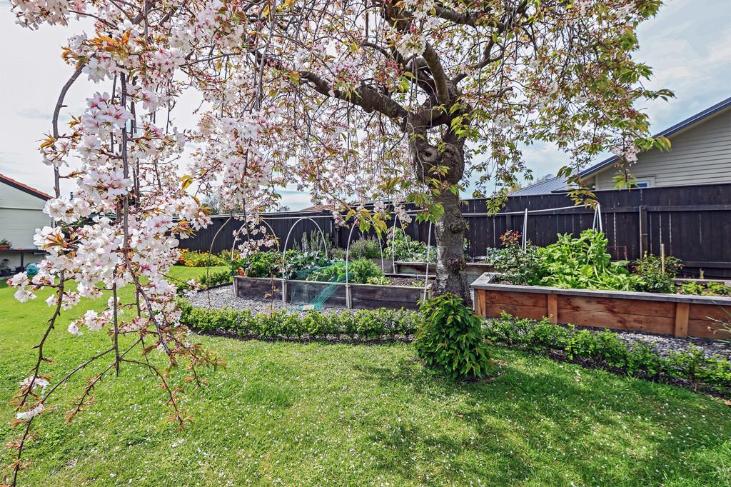 Out back, the leafy, well-tended section is dotted with fruit trees and raised veggie beds, plenty of room to grow, relax, and enjoy.