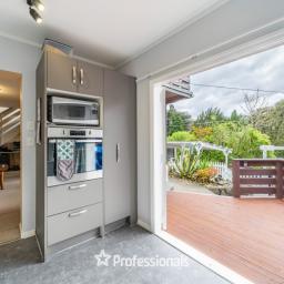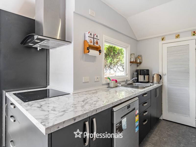 Upon entering, you are welcomed into a warm and inviting open-plan living and dining area, complete with a wood burner and bathed in natural light. The kitchen has been tastefully renovated and features induction hobs, a modern oven, benchtops, and cabinetry. French doors open seamlessly from the kitchen to a sun-drenched deck, perfect for outdoor entertaining.