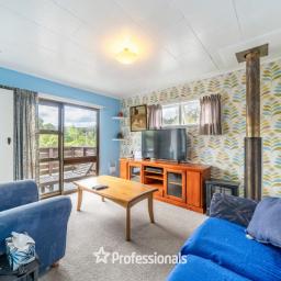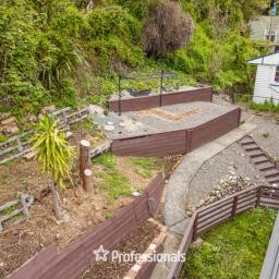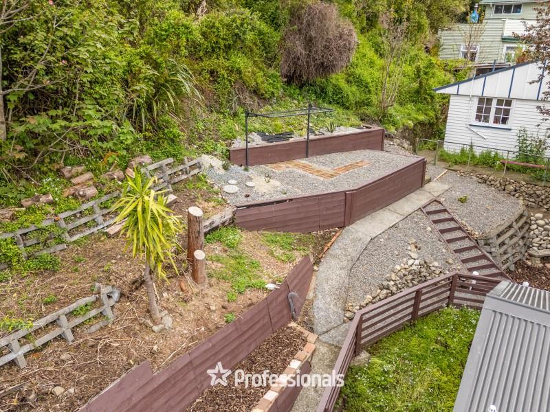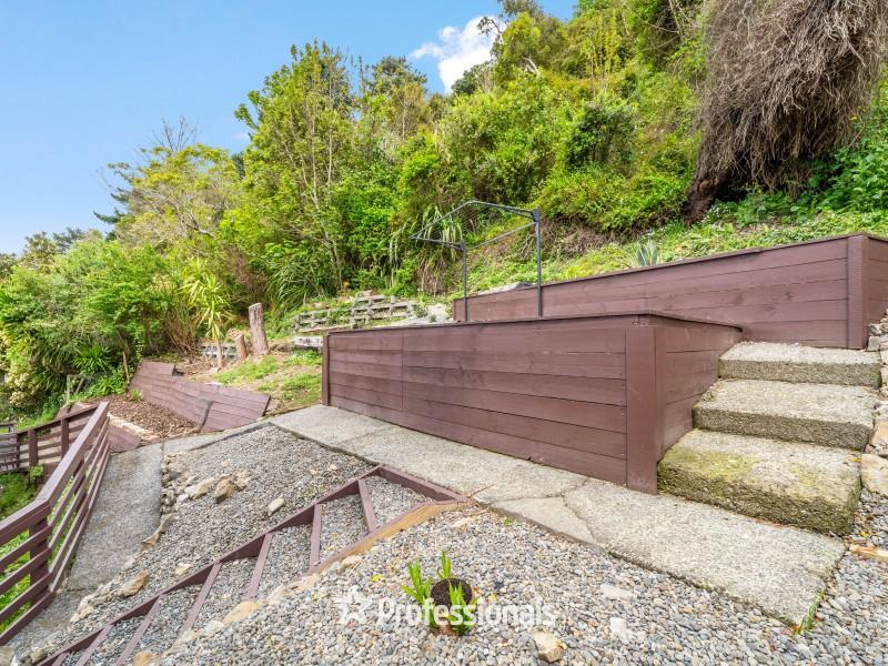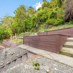 Outside, the terraced section is beautifully landscaped and bordered by native bush, offering peace and privacy. Additional features include a single garage, a separate storage shed, off-street parking for 2–3 vehicles, and a fully fenced front yard.