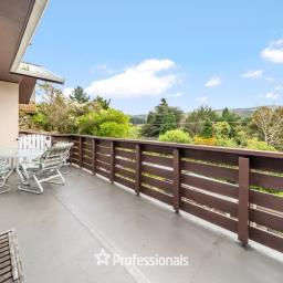 Upstairs, you will find a second living area or an additional bedroom, depending on your needs. This space benefits from the warmth of the flue running through during the winter months and opens via sliding doors to a spacious deck, offering stunning views and abundant sunlight. Two further bedrooms with built-in wardrobes, a second bathroom featuring a spa bath, and a separate laundry complete the upper level.