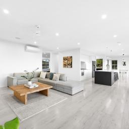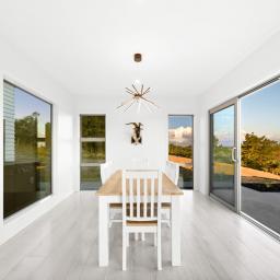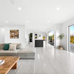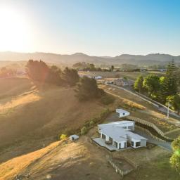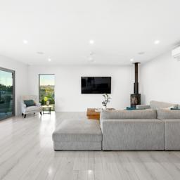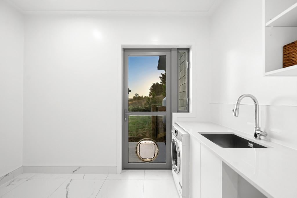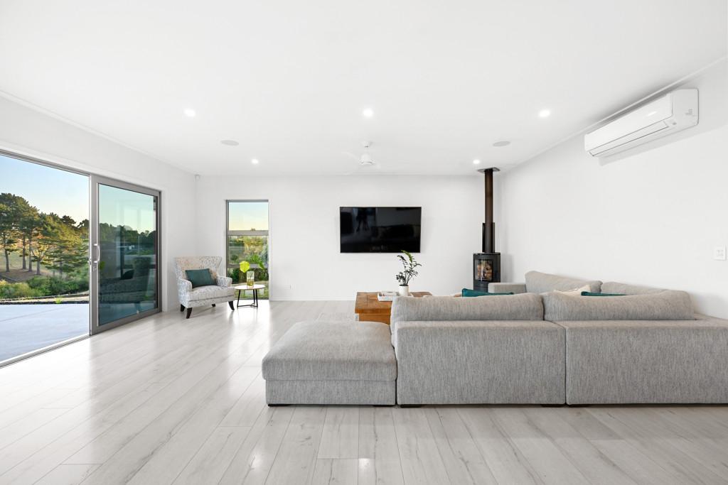 The 7018m2 block is easily cared for and segmented into separate sloping paddocks currently home to Earl & Jacko the family donkey and Alpaca. The home itself sits proudly on a flat plateau and features 4 generous sized bedrooms. The master suite is positioned at one end and the family sleep zone at the other. Spacious luxury tiled bathrooms add to the feel of contemporary living.