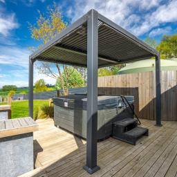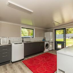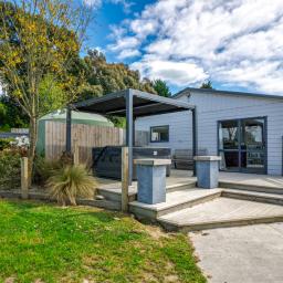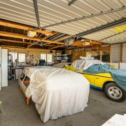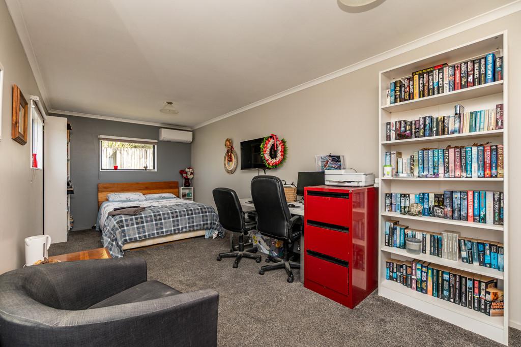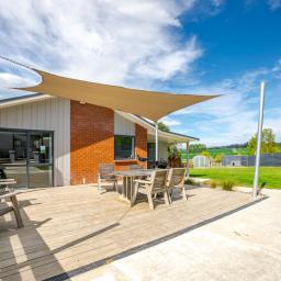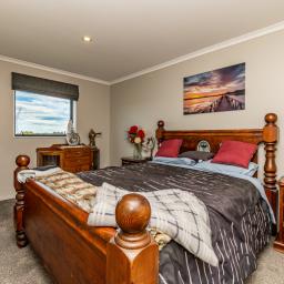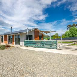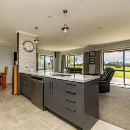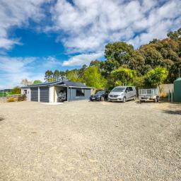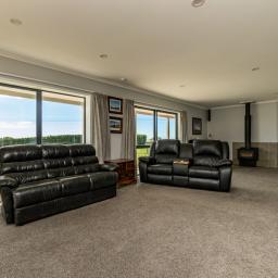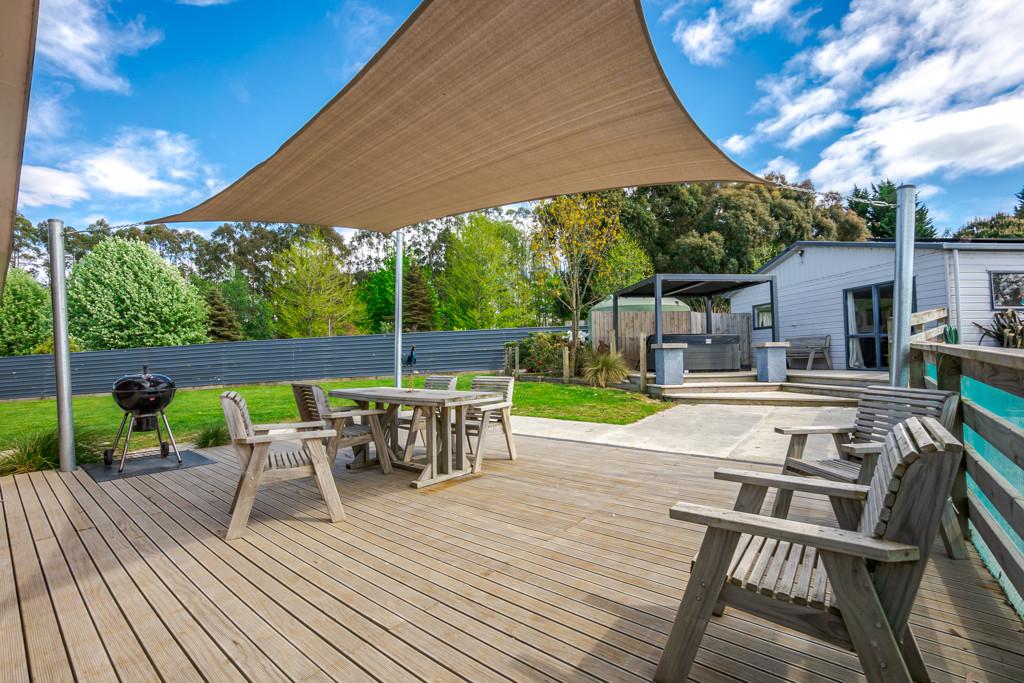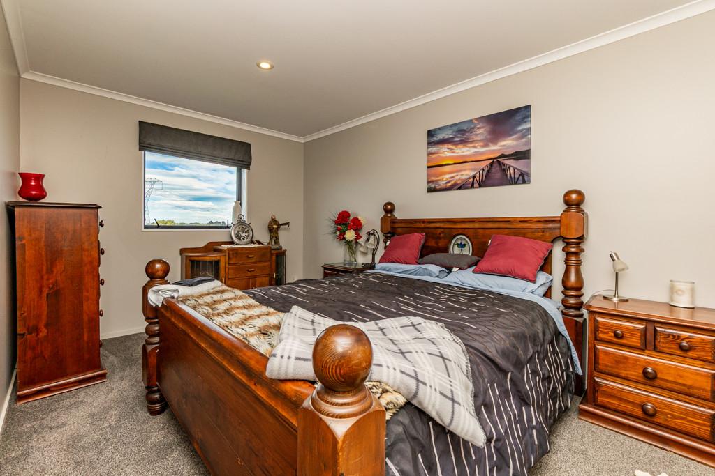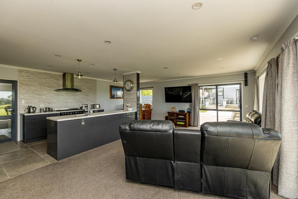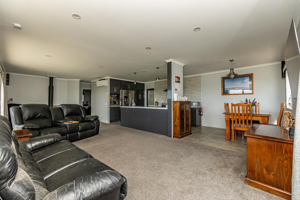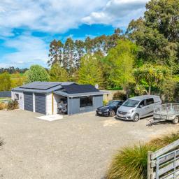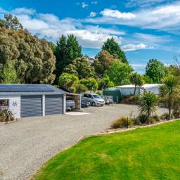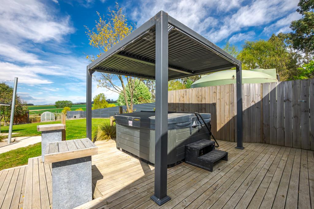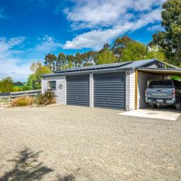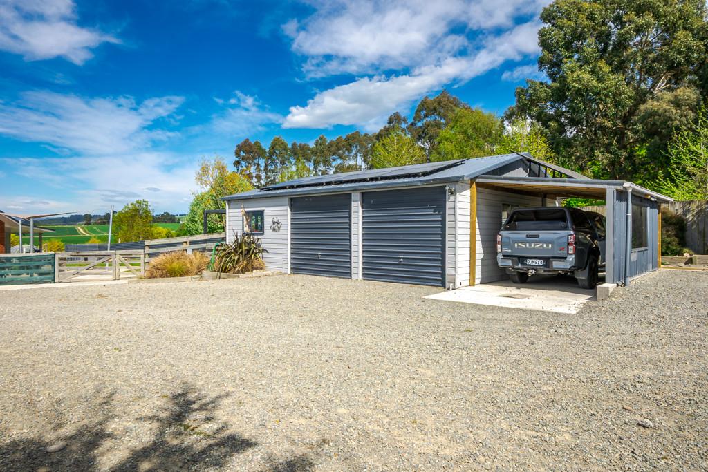Sliding doors open to a northwest-facing deck with shade sail and a stand alone louvred spa platform, the perfect place to unwind beneath the stars. A large laundry, double garage with attached sleepout or office (complete with heat pump), a new two-bay implement shed, and ample parking complete the home's thoughtful design.
