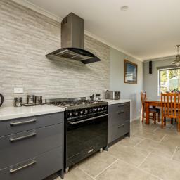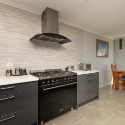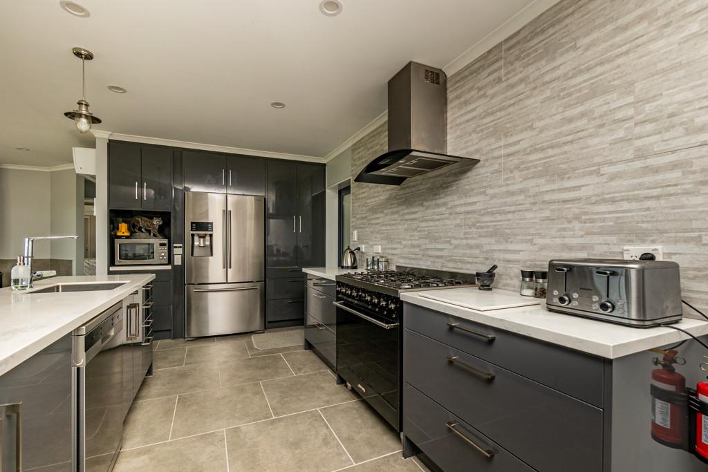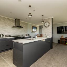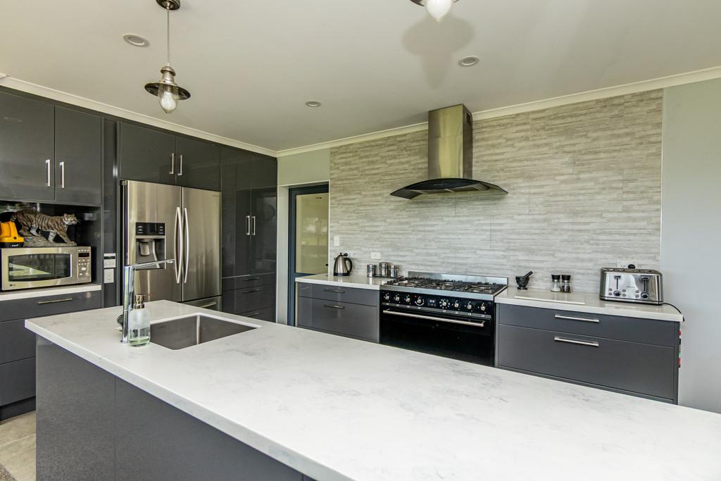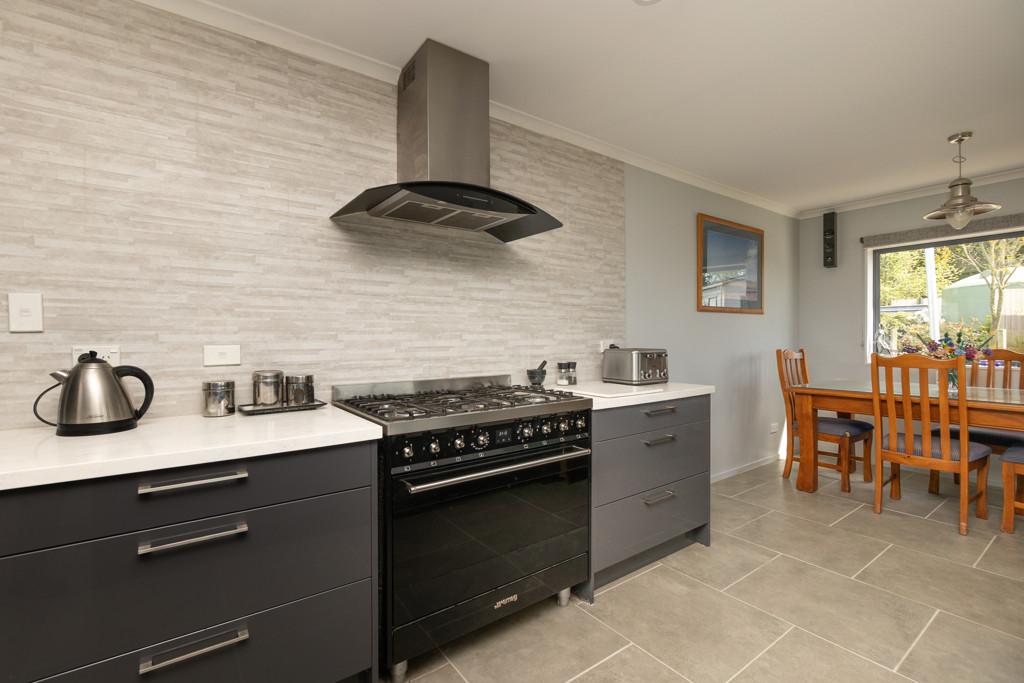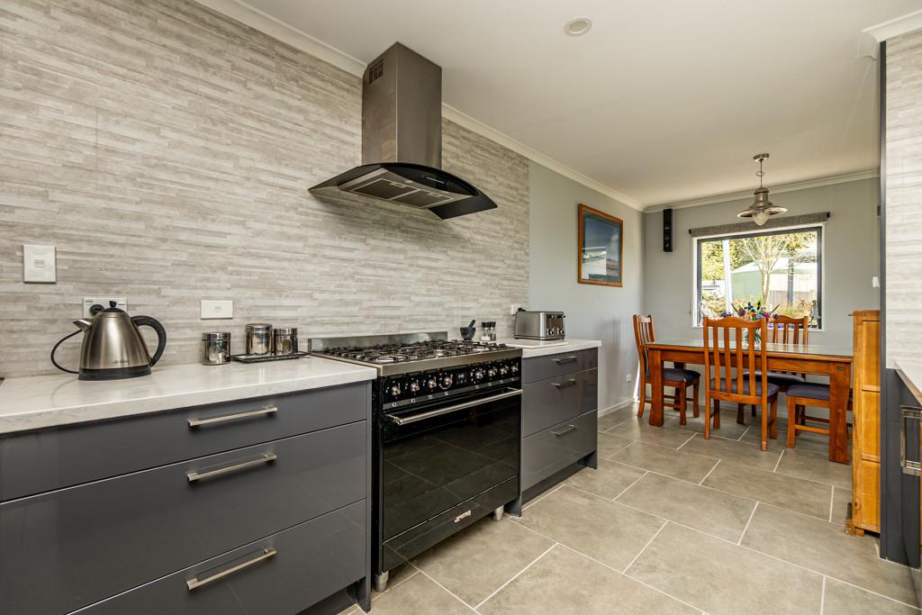 At the heart of the home, the open-plan kitchen, dining, and living space exudes light, volume, and sophistication. The designer kitchen showcases an island bench, SMEG gas cooktop and oven, large rangehood, plumbed-in fridge (included), dishwasher, and abundant storage. The lounge is both relaxed and refined, warmed by a log fire and heat pump, and enhanced by a hard-wired surround-sound system for effortless entertaining.