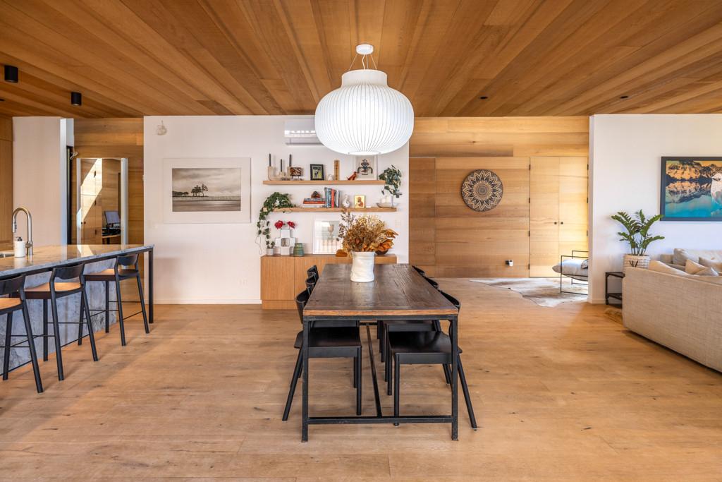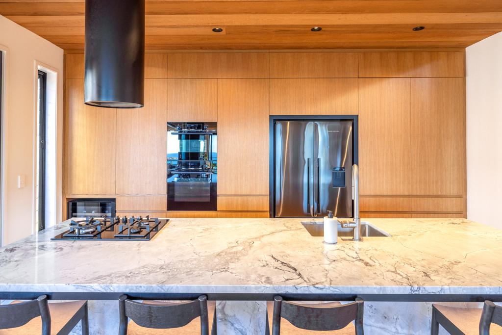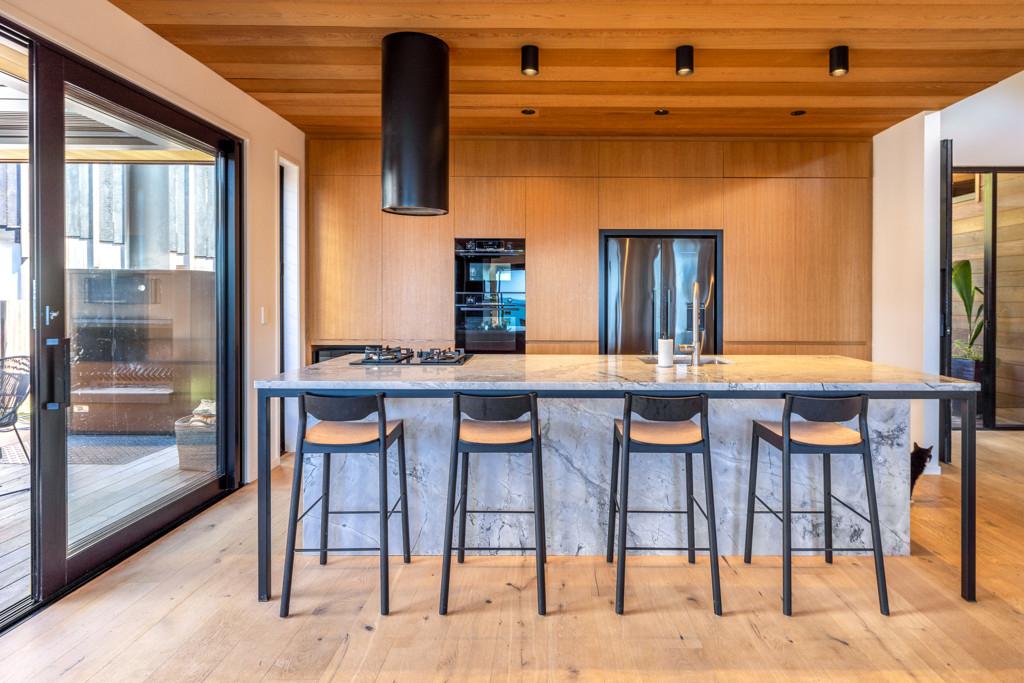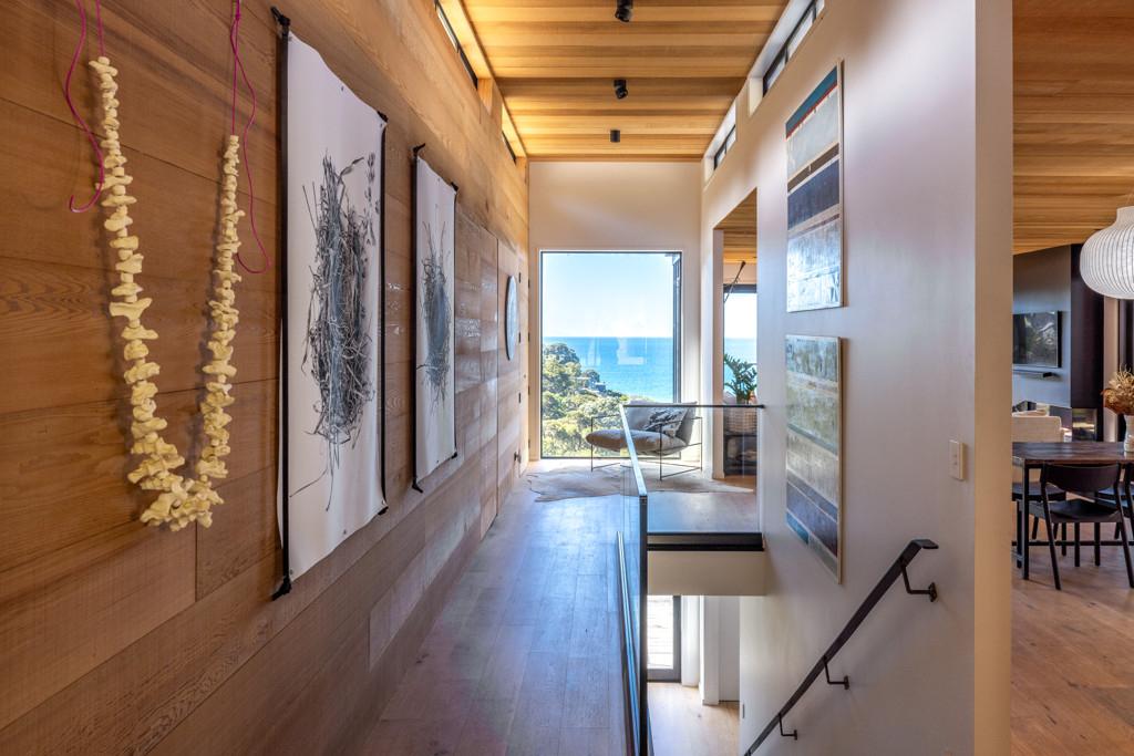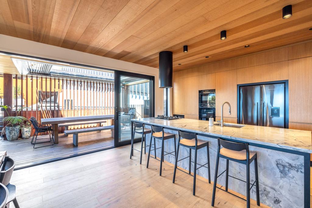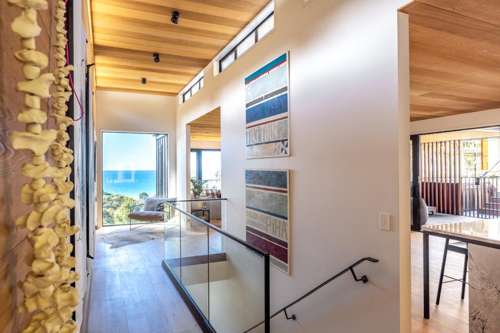 At its heart, a Shane George-designed kitchen anchors the home, a true entertainer's space blending functionality with artful detail. The open-plan living and dining areas spill out through floor-to-ceiling glass, framing panoramic ocean views and bathing every corner in natural light.