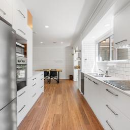 The sleek, modern kitchen is the true heart of this home, a space where style and function blend effortlessly. Thoughtfully designed with clean lines, quality appliances, and an abundance of natural light, it's perfect for both everyday living and elegant entertaining. The generous benchtops and clever storage solutions make cooking a joy, while the open-plan design connects seamlessly to the dining and outdoor living areas, ensuring you're always part of the conversation.
