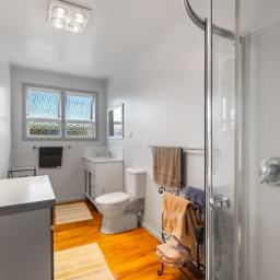 The central bathroom features polished native timber flooring and has a corner shower with a shower dome to eliminate any condensation or moisture, toilet, basin and extractor fan with built in heat lamp combined with lights. There is a separate toilet with a basin.