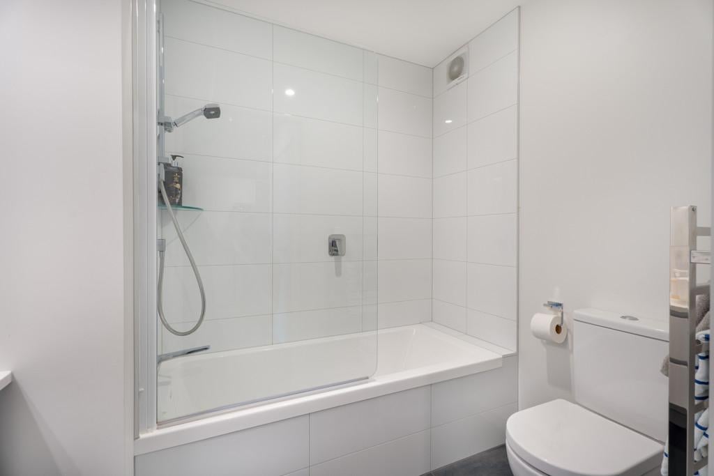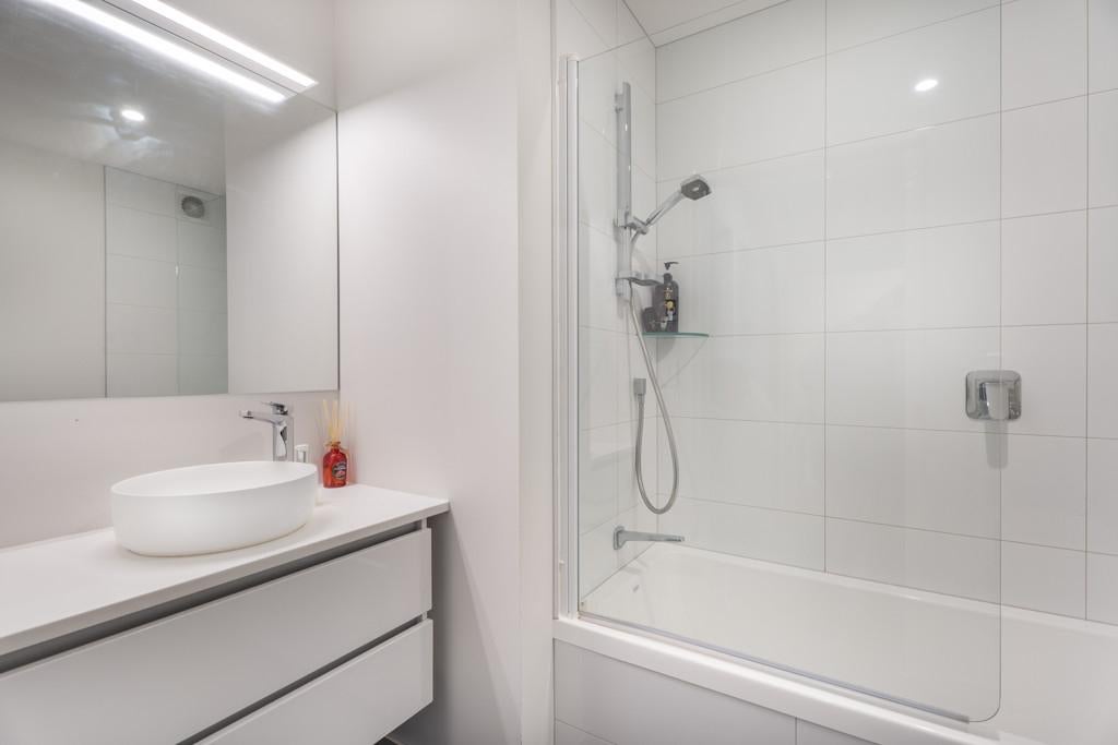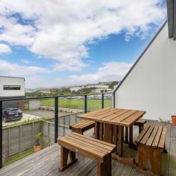 Upstairs the light filled living room with an extra high ceiling opens to a private balcony to enjoy the water views and the sun at the end of the day. The main bedroom has an en-suite bathroom and there's also a separate guest toilet.