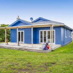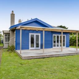 Tucked behind hedging, this cheerful blue home is perfect for a family who enjoys life by the ocean.
