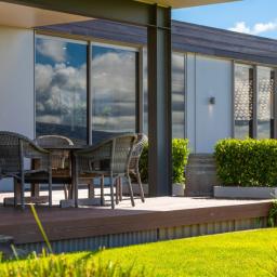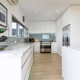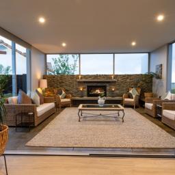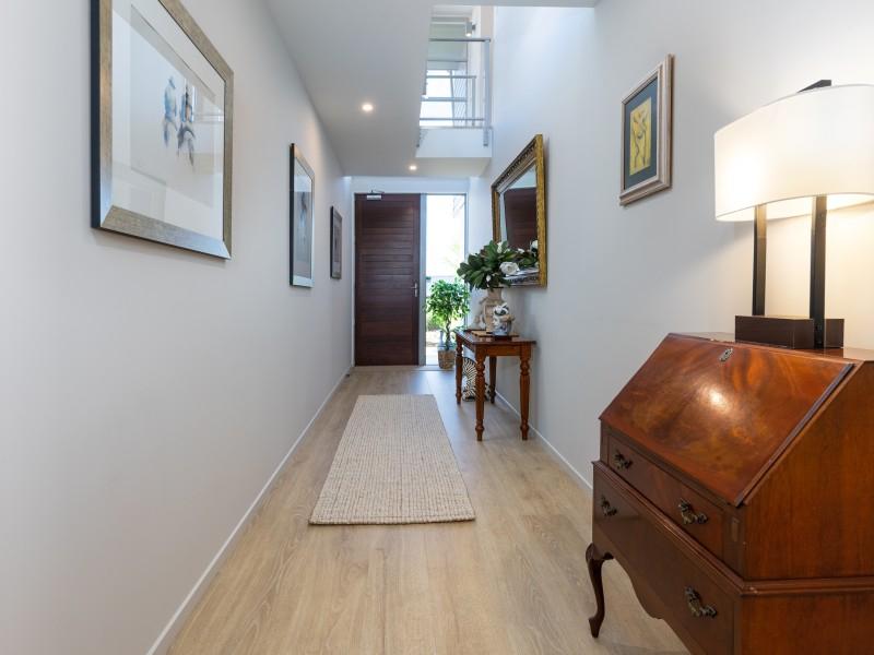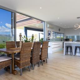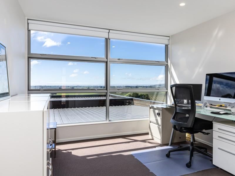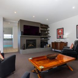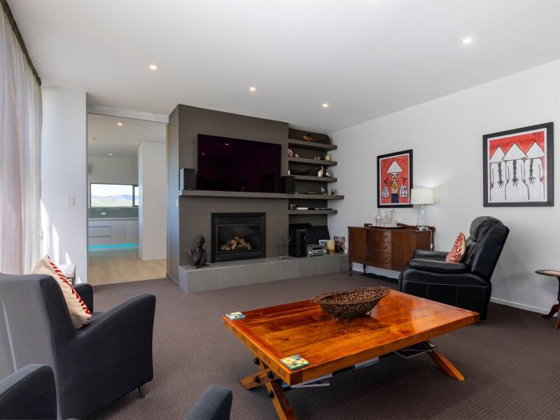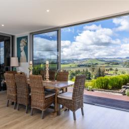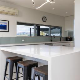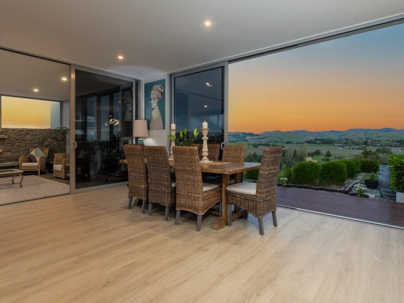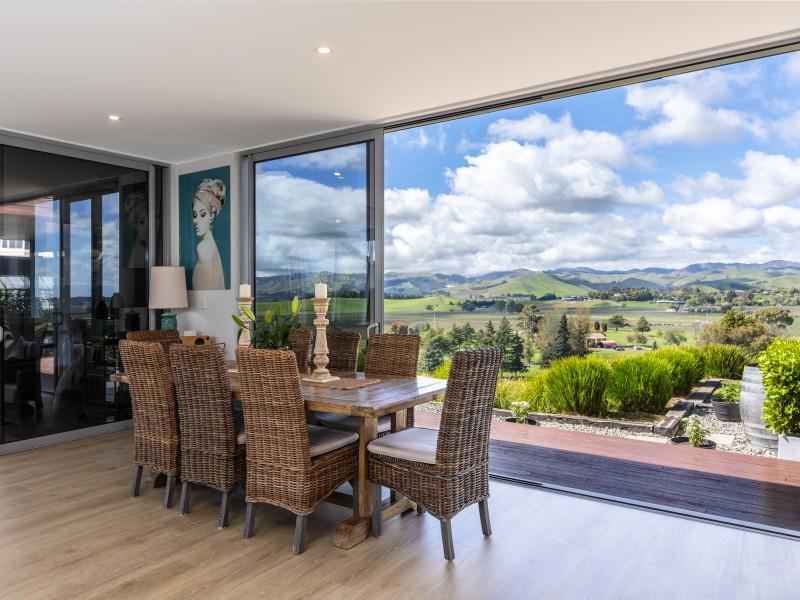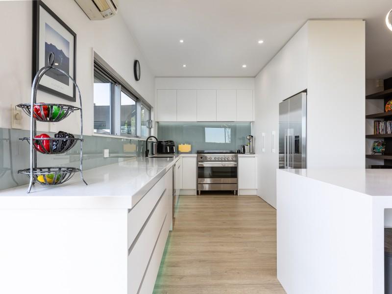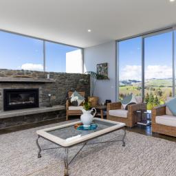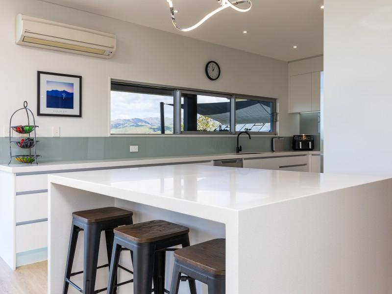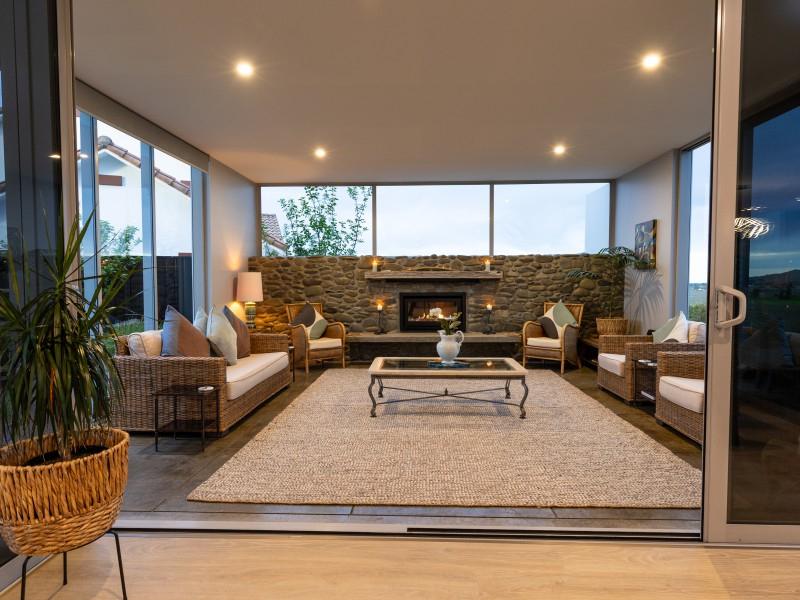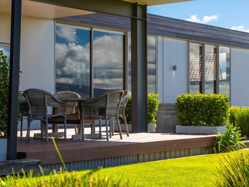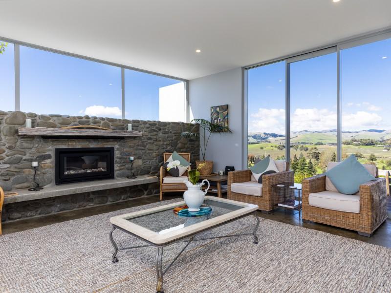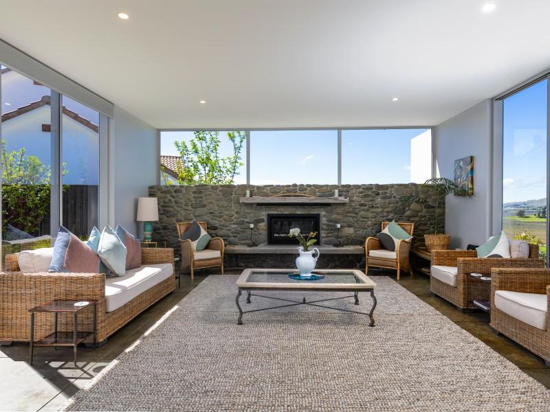 Architecturally designed, the house features a high stud and clean lines with windows and doors to capture the views and facilitate an easy flow inside and out. A newly renovated kitchen, boasting Tristone benches and a 900mm pyrolytic oven, leads to open plan dining, living and an outdoor room, cleverly designed with sliding glass doors and a gas fire set in a stone wall, making it a popular spot throughout the year.
