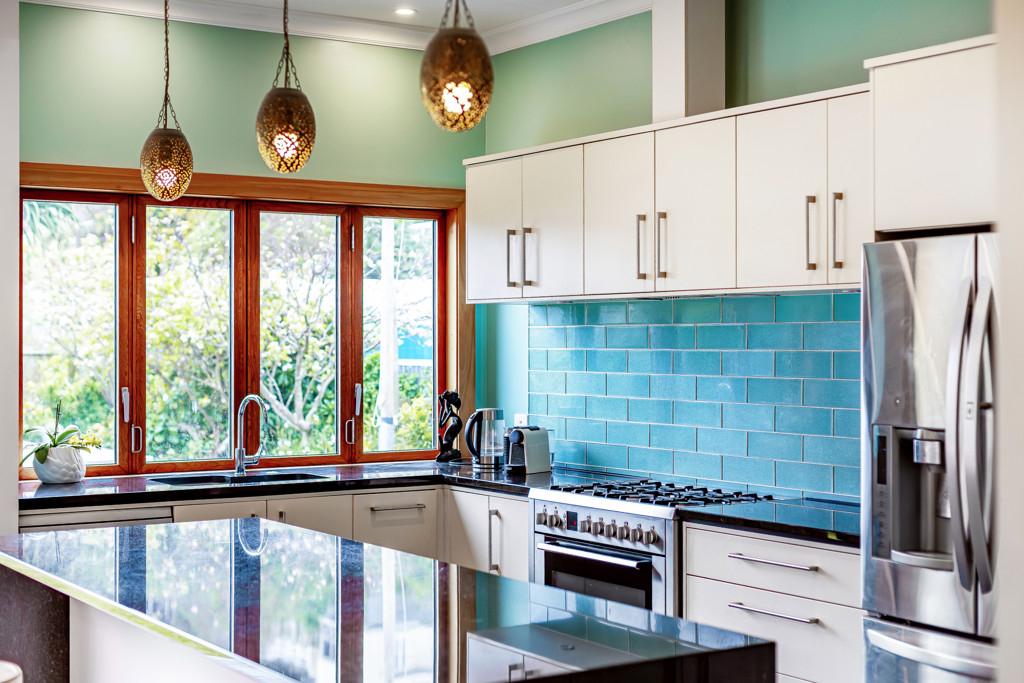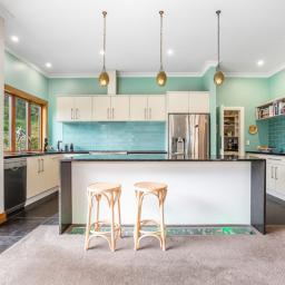 • A modern kitchen with a huge central island, abundant bench and cupboard space, with a large scullery