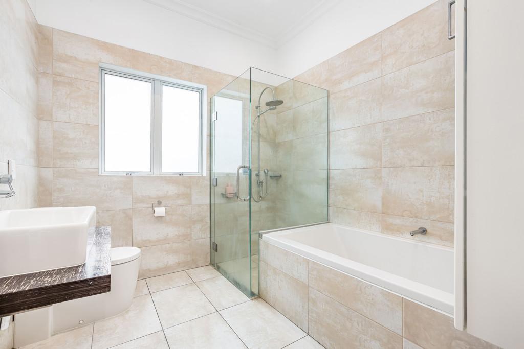 • Stylish tiled family bathroom featuring a large bath and separate shower. Big separate laundry room opens to the garden space