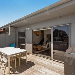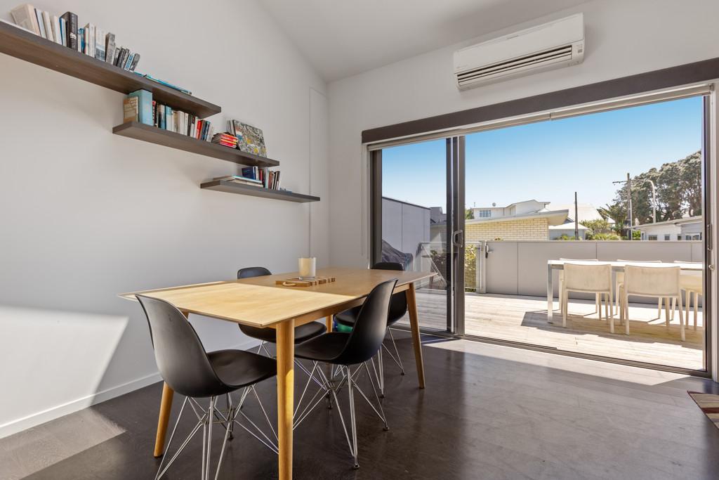 The living flows effortlessly into the spacious north facing deck - perfect for alfresco dining and relaxing while listening to the waves from the Tasman Sea.