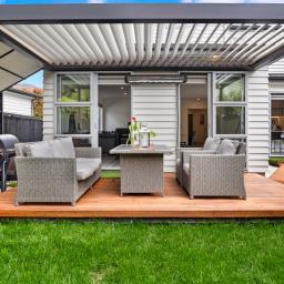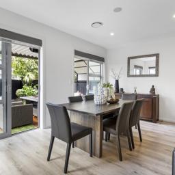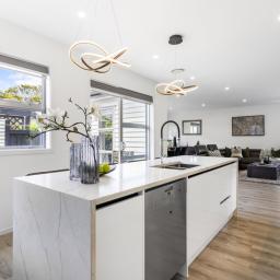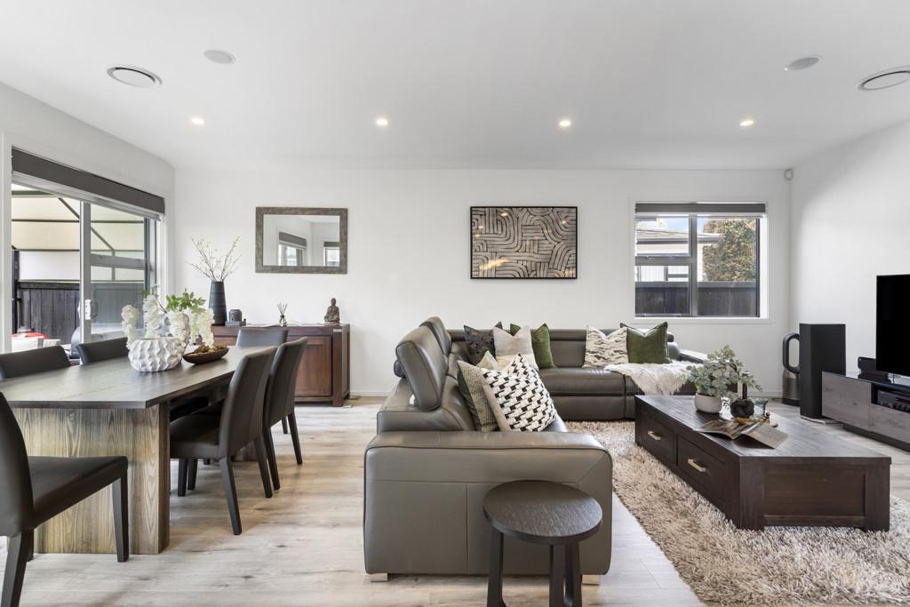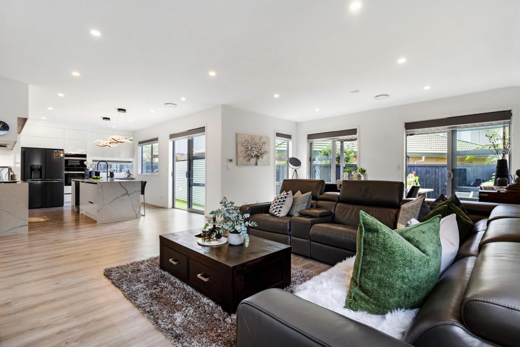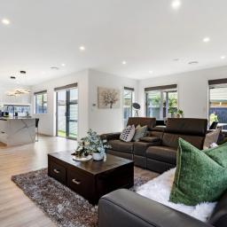 The home welcomes you with an expansive open-plan living layout, where the kitchen, living, and dining areas flow seamlessly into one another - ideal for both relaxed family living and grand-scale entertaining. Soaring high stud ceilings and an abundance of natural light create a sense of space and serenity, making this the perfect environment for everyday living and hosting guests. Whether you're preparing a meal in the sleek, top-of-the-line kitchen or unwinding in the inviting lounge area, this home effortlessly blends functionality with style.