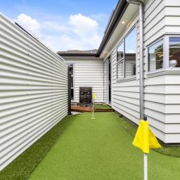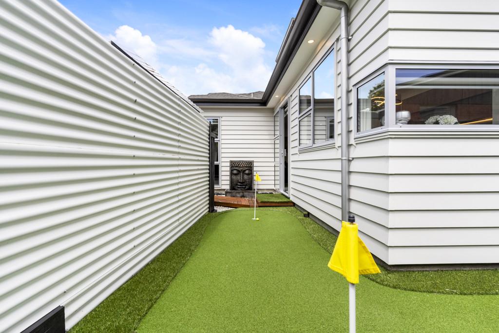 Step outside to your own private oasis - a fully fenced backyard featuring a custom-built putting green, perfect for entertaining or simply unwinding in style.