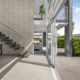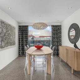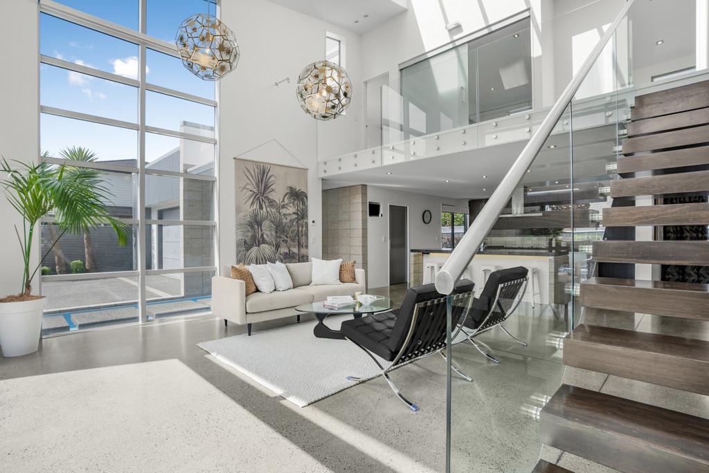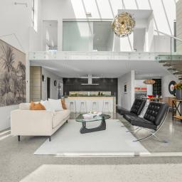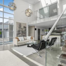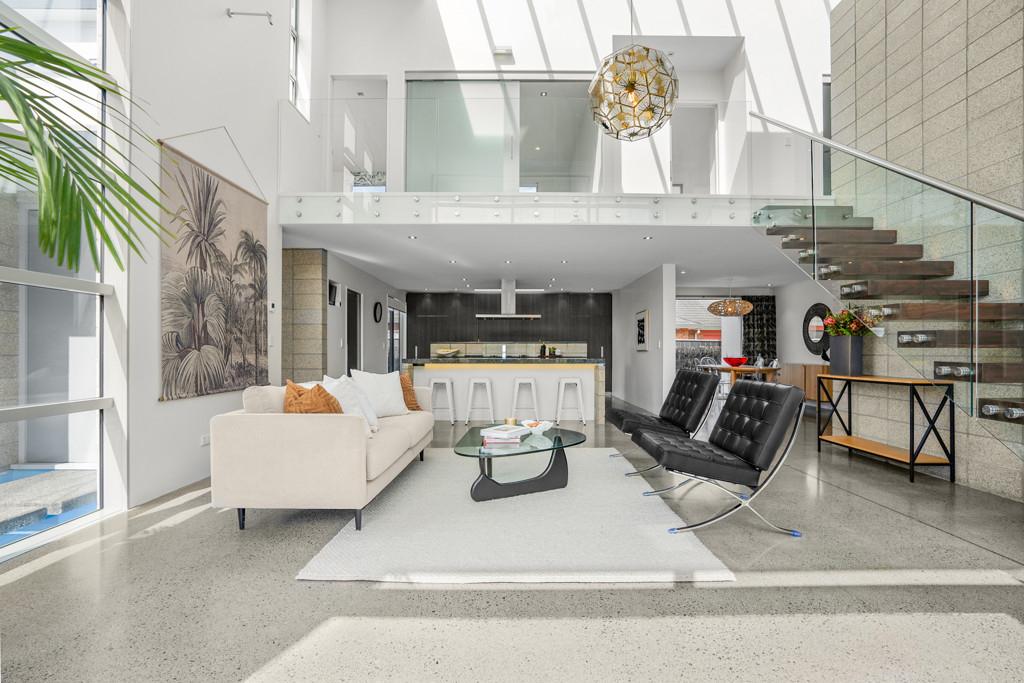From the moment you enter, the home exudes light, space, and style. Expansive glazing floods the interior with natural light, highlighting the sleek polished concrete floors and creating a seamless harmony between structure and environment.